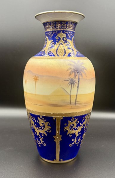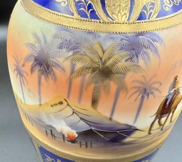 【希少】オールドノリタケ 盛上金彩 マルキ印 コバルトブルー地 キャメル砂漠風景 花瓶 里帰りアンティーク 高さ25.7cm 1920年代頃 T013