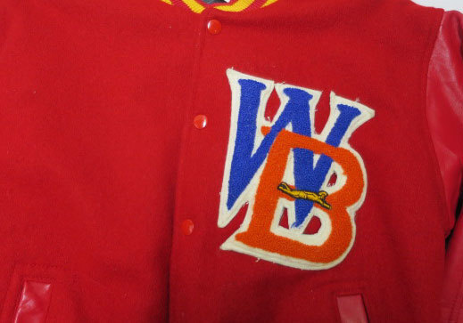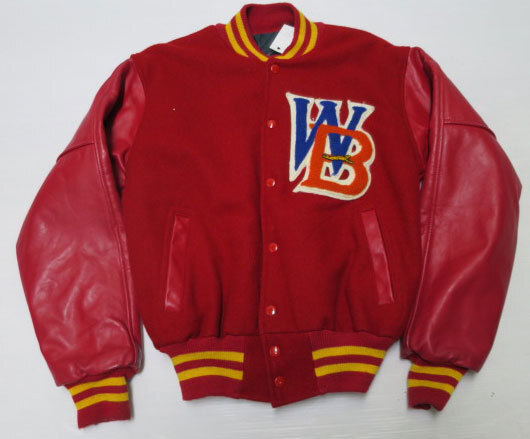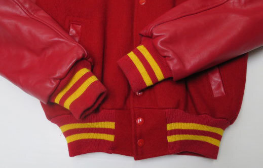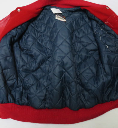 アメリカ買い付けのアワードジャケットで外装はウール混Xレザー(袖&ポケット縁)で裏地は恐らくポリエルテルの中綿入りで左胸はレタード貼り付けの赤X黄ラインです。