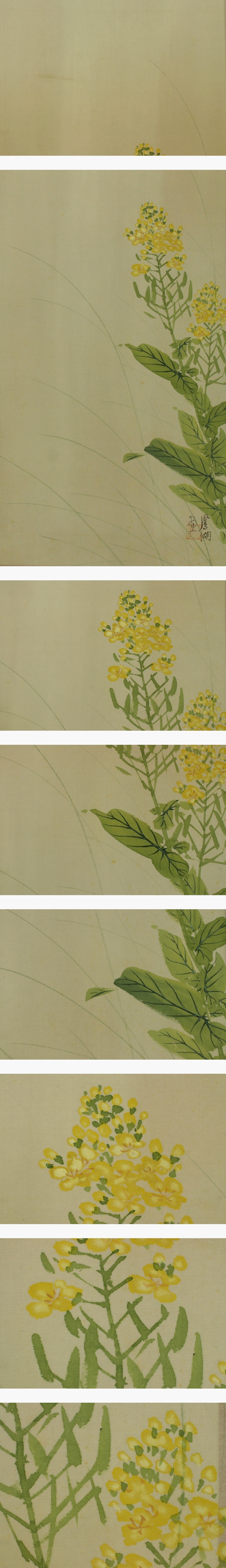 村上鳳湖 むらかみ-ほうこ(1879-1955) 明治12年、愛媛県生まれ。本名は利右衛門。 別号は白雲道人。松本楓湖、川合玉堂に学ぶ。 明治32年日本絵画協会展に「齋藤實盛決死」を初出品、その後も同展に「熊谷父子出陣」、 「小山田高家援義貞」などを出品し、二等褒状等受賞多数。 40年第1回文展入選、以後も連続入選を重ねて活躍した。 昭和31年2月10日没。77歳。 本紙は、染み痕、ヤケ痕があります。 表装は、良好です。 【サイズ】 作品 横約25cm×縦約106cm 表装 横約34cm×縦約180cm |