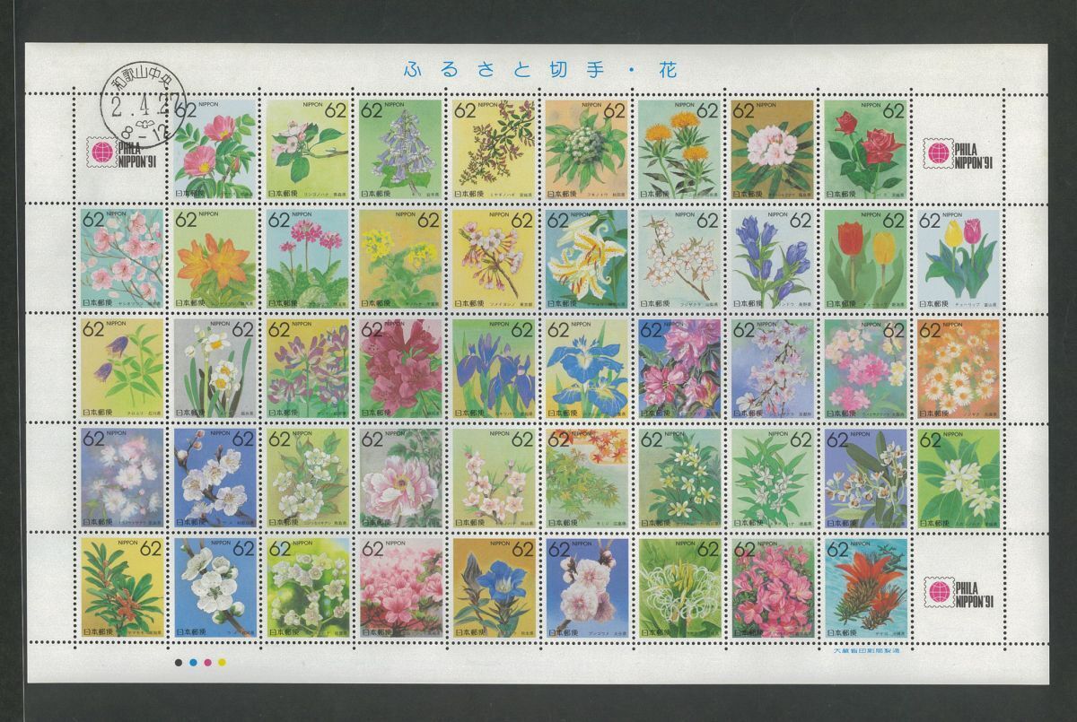 日本切手 1990年 ふるさと切手・花(都道府県の花)62円 47枚シート 初日印付