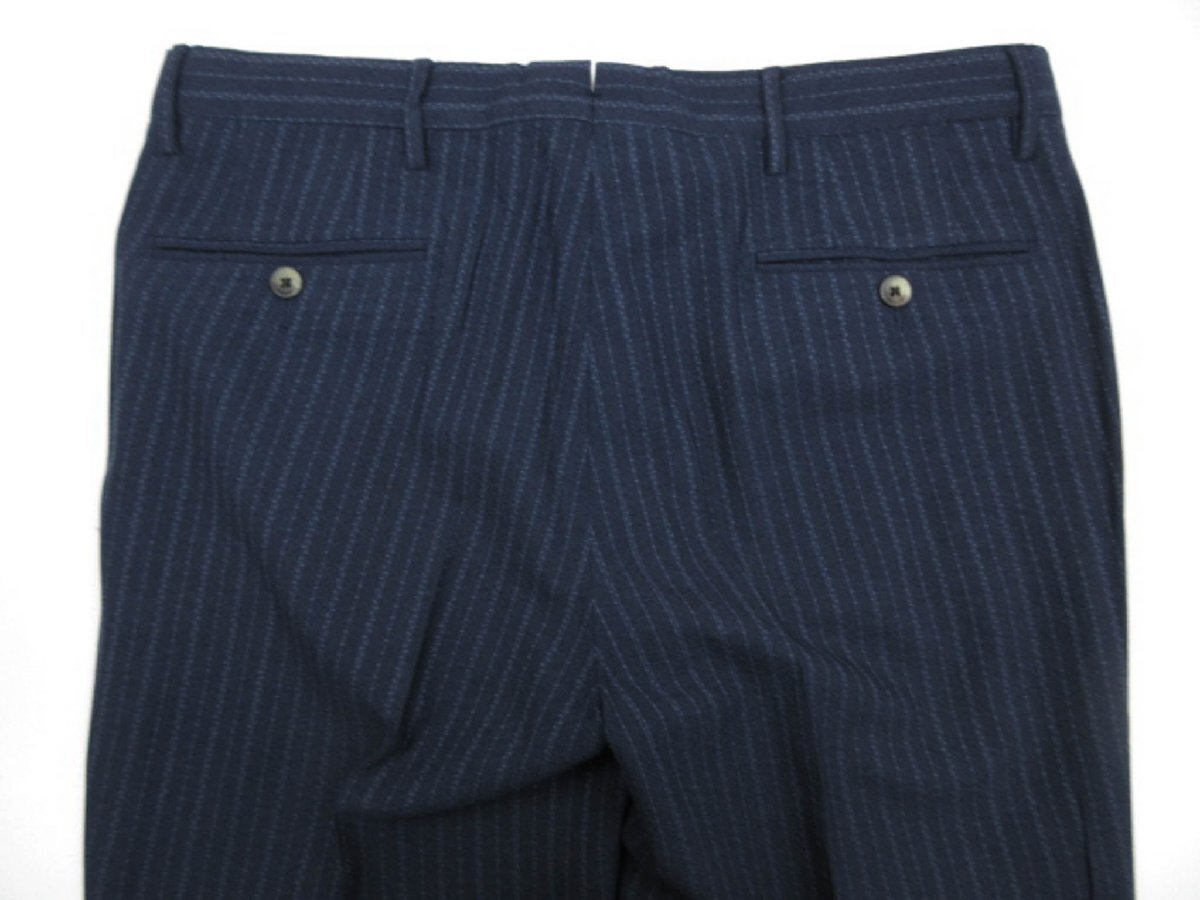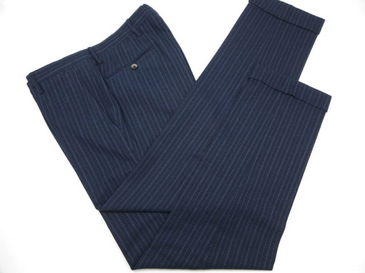 ・スラックス・・・ウエスト実寸約82センチ(2センチ出し、4センチ詰め可能)、股上約23センチ、渡り幅約31センチ、股下約76センチ、総丈約97センチ、裾幅約18.5センチ、ダブル仕上げ(ダブル幅約4センチ、最大でプラス10センチ長くできます)