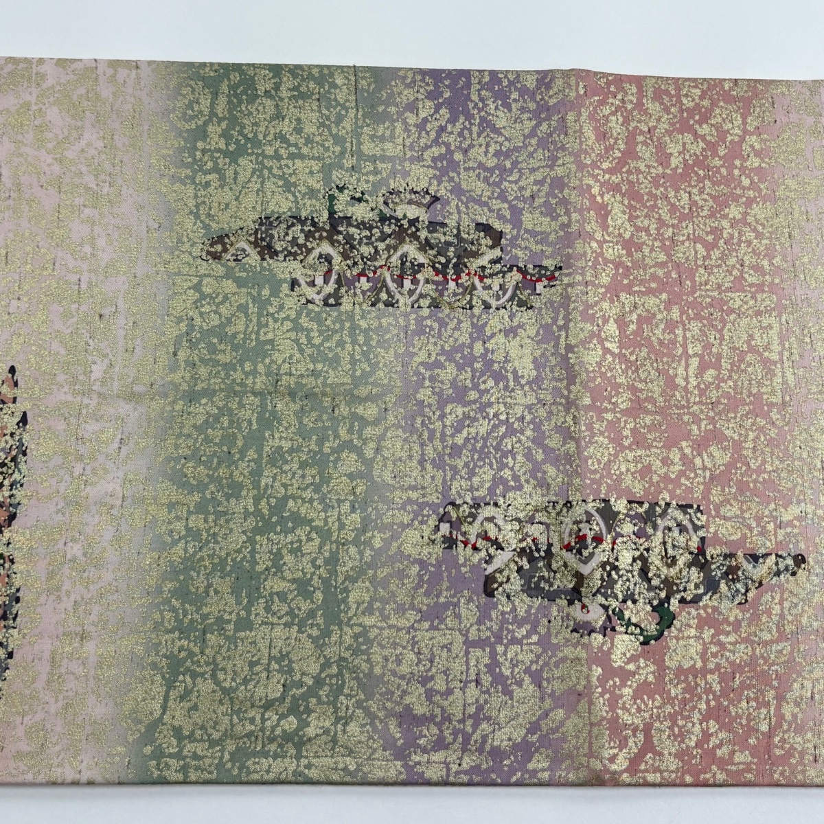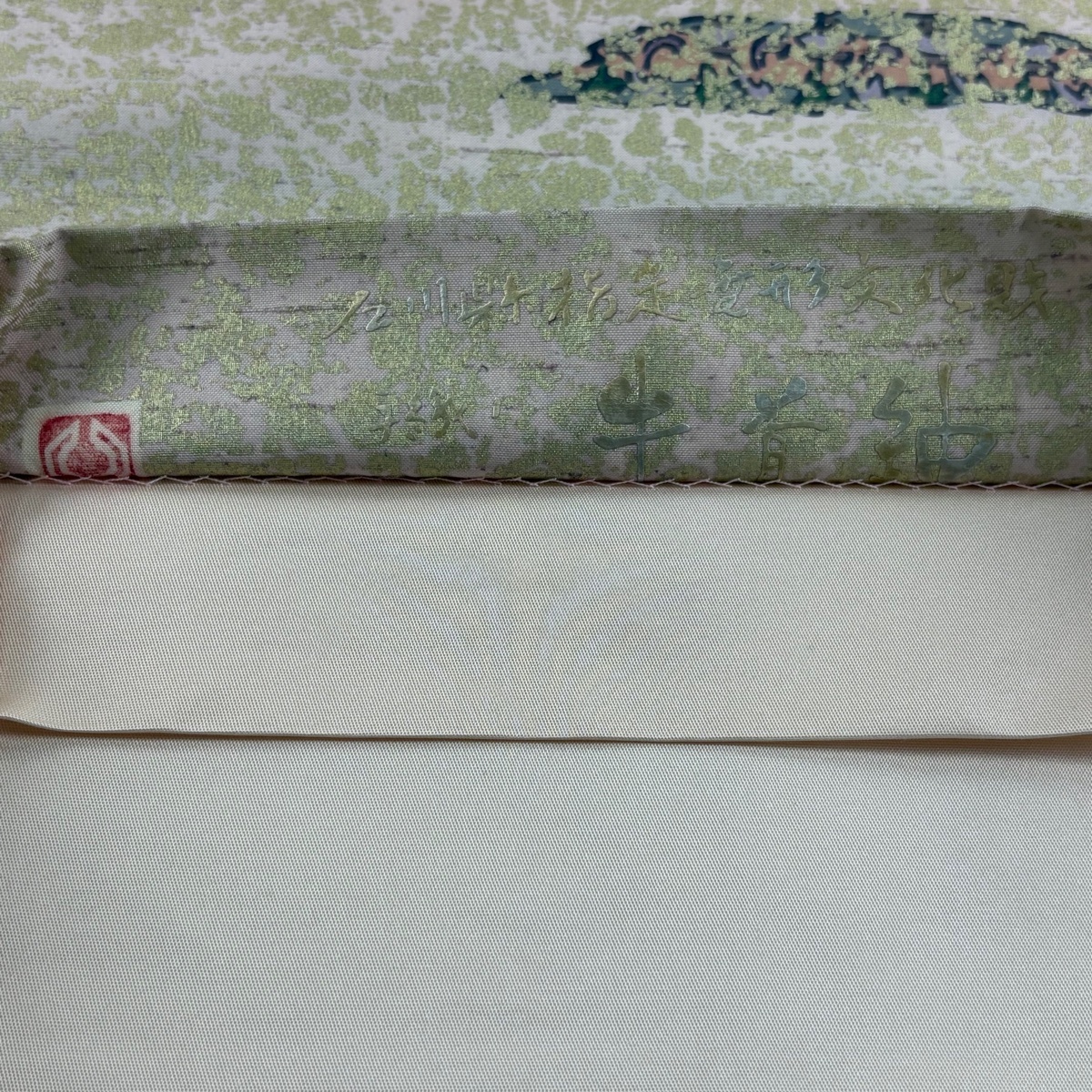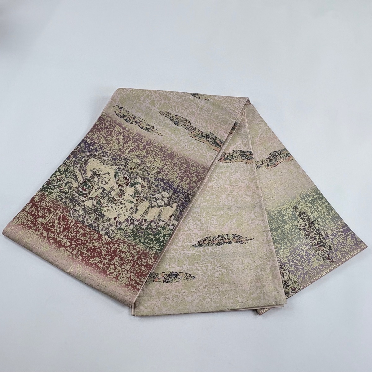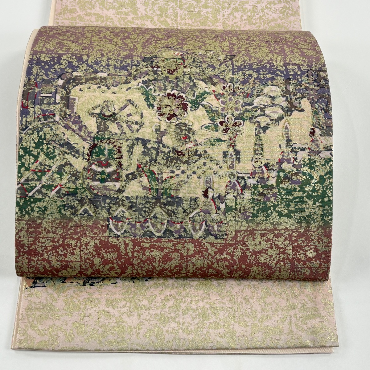 | 袋帯 逸品 落款 牛首紬 狩猟文 草花 金彩 薄ピンク お太鼓柄 正絹 【中古】 |