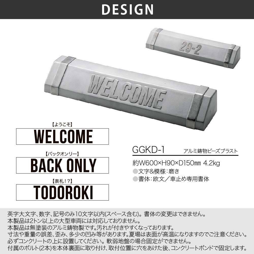 商品詳細 | 英字大文字、数字、記号のみ10文字以内(スペース含む)。 書体の変更はできません。 本製品は2トン以上の大型車両には対応しておりません。 本製品は無塗装のアルミ鋳物製です。汚れが付きやすくなっております。 寸法や重量の誤差、歪み、多少の凹み等があります。夏場は表面が高温になりますのでご注意ください。 必ずコンクリートの上に設置してください。 軟弱地盤の場合固定ができません。 付属のボルト(2本)を本体裏面に取り付け、取付位置に穴をあけた後、コンクリートボンドで固定します。 |