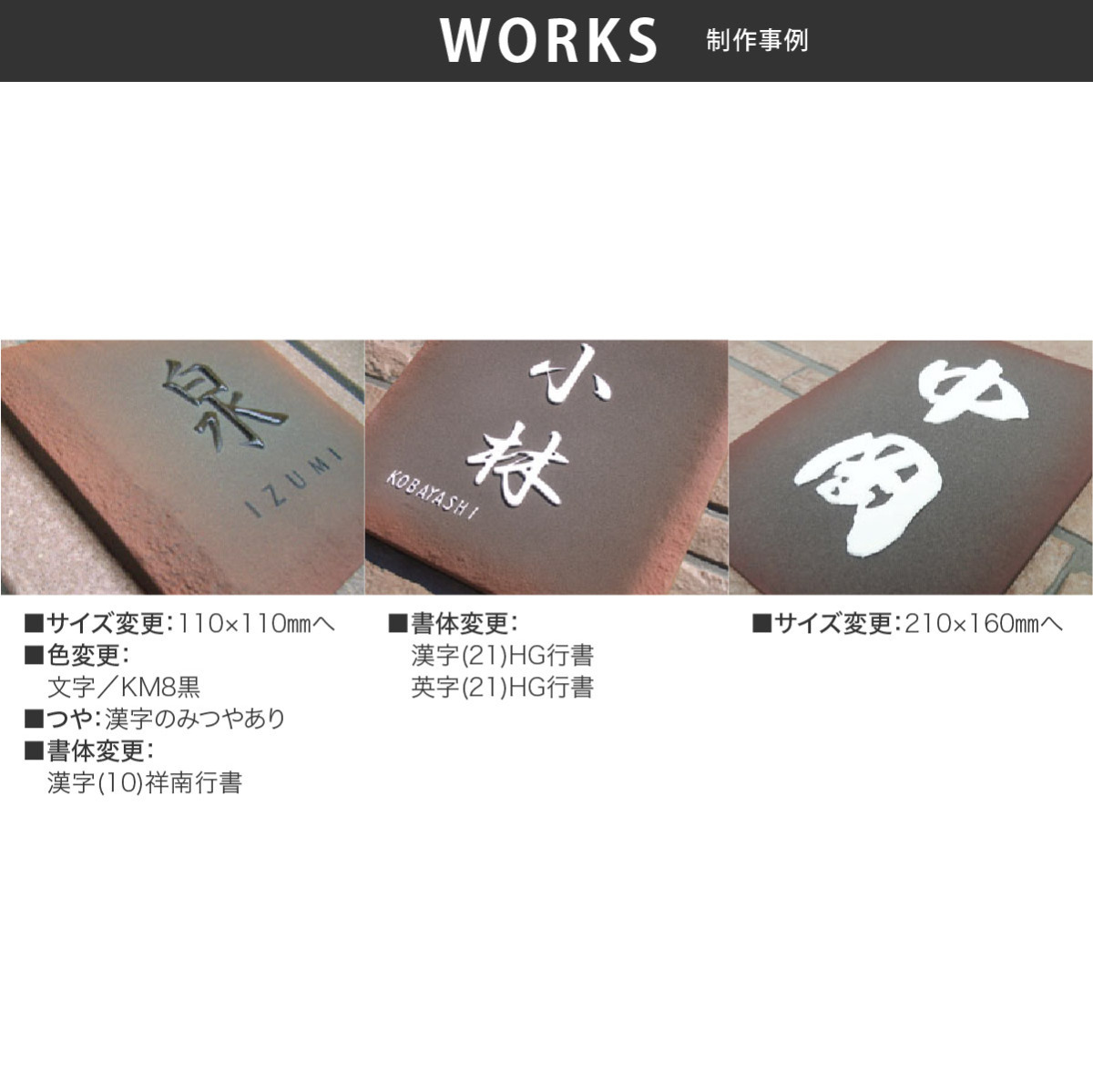 商品詳細 | 信楽の濃赤土と黒泥に白化粧土の凸字のコントラスト、大好評の戯遊詩画人「泉椿魚」氏揮毫の椿魚書体が標準仕様のシンプルながらも高級感ある表札です。縁起の良い浮き出し文字(凸文字)表札は全国でも珍しく、川田美術陶板ならではの技術です。 |