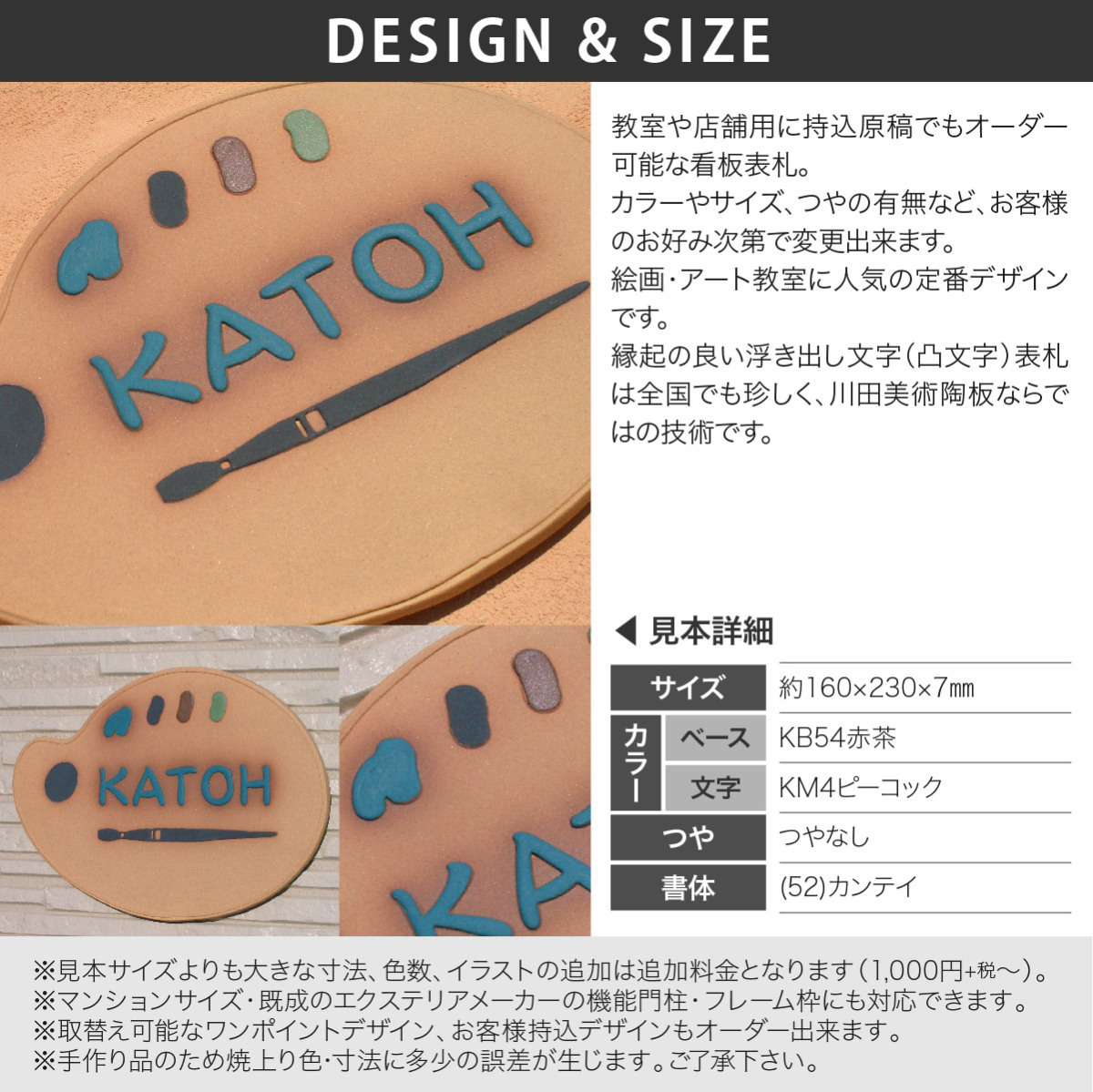 商品詳細 | 教室や店舗用に持込原稿でもオーダー可能な看板表札。カラーやサイズ、つやの有無など、お客様のお好み次第で変更出来ます。ピアノ教室の看板にもおすすめのデザインです。縁起の良い浮き出し文字(凸文字)表札は全国でも珍しく、川田美術陶板ならではの技術です。 |