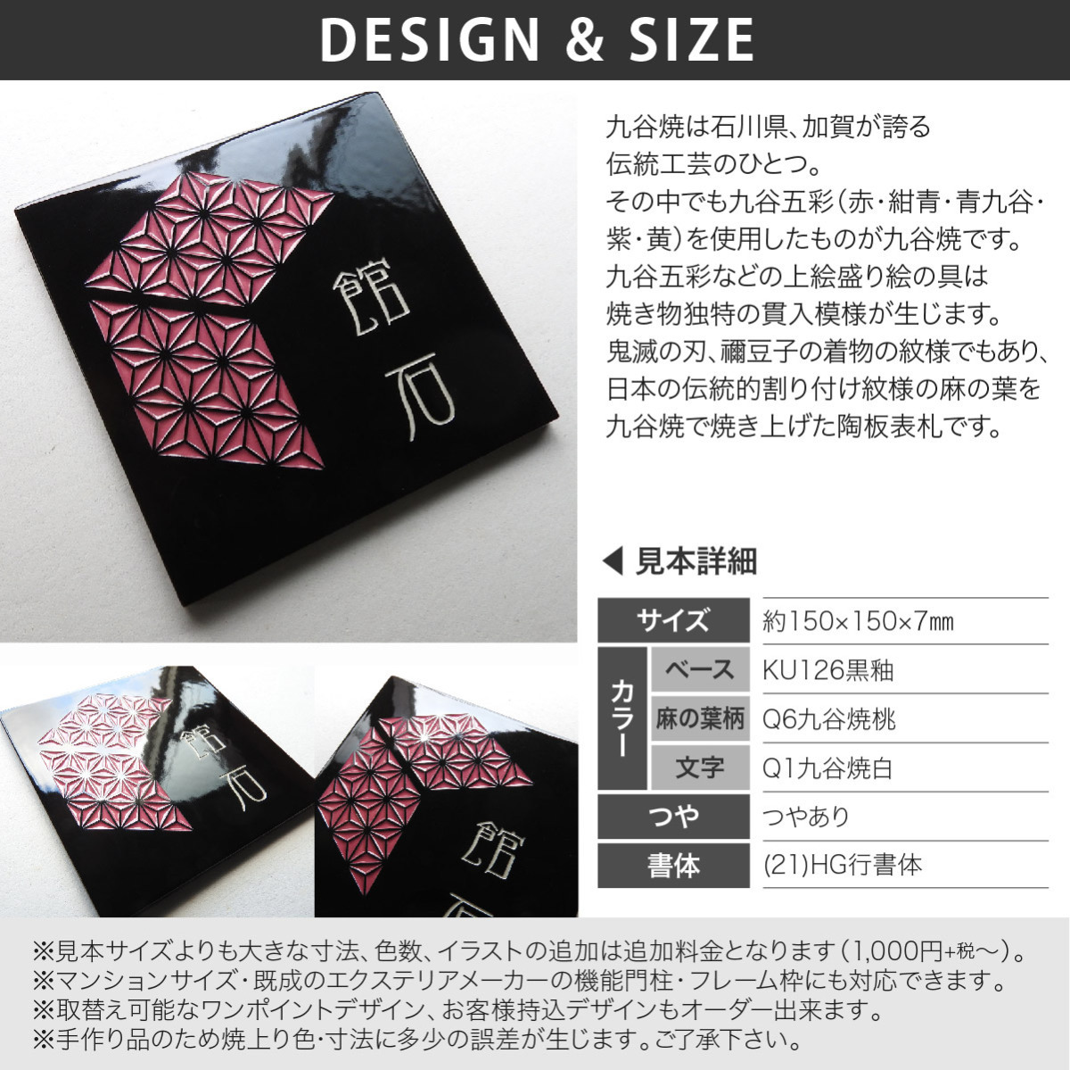 商品詳細 | 九谷焼は石川県、加賀が誇る伝統工芸のひとつ。その中でも九谷五彩(赤・紺青・青九谷・紫・黄)を使用したものが九谷焼です。九谷五彩などの上絵盛り絵の具は焼き物独特の貫入模様が生じます。鬼滅の刃、禰豆子の着物の紋様でもあり、日本の伝統的割り付け紋様の麻の葉を九谷焼で焼き上げた陶板表札です。 |