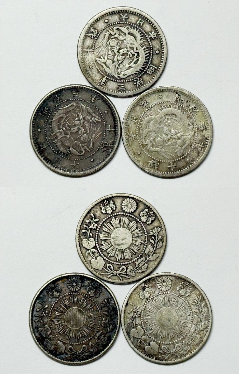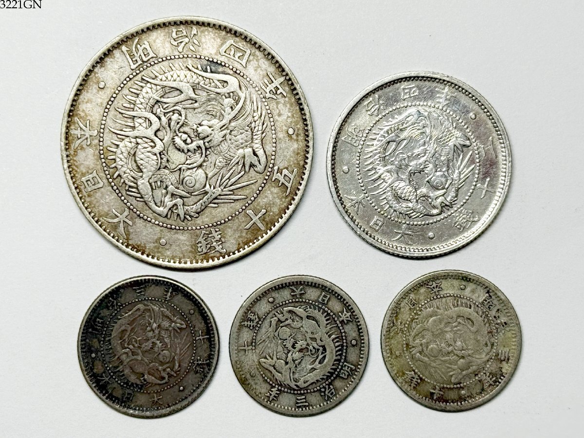 送料無料 旭日竜50銭銀貨 旭日竜20銭 旭日竜10銭 計5枚 おまとめ 五十銭 二十銭 十銭 古銭 旧日本貨幣 3221GN-20