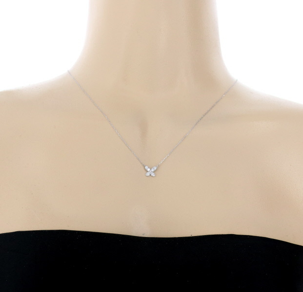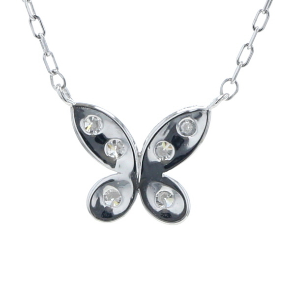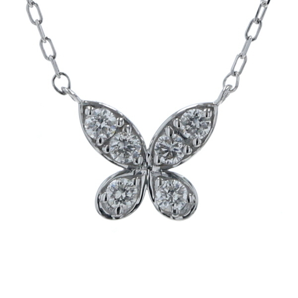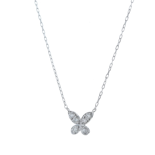 商品紹介 | K18ホワイトゴールド製のネックレスです。 長さは約46cmで、胸元にゆったりと映えるサイズ感です。 0.15ctのダイヤモンドをあしらった蝶モチーフのデザインです。 繊細なバタフライのフォルムに、ダイヤモンドの煌めきが軽やかな印象を添えます。 ホワイトゴールドの清らかな光沢と調和した、上品でフェミニンなジュエリーです。 |