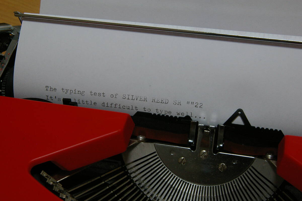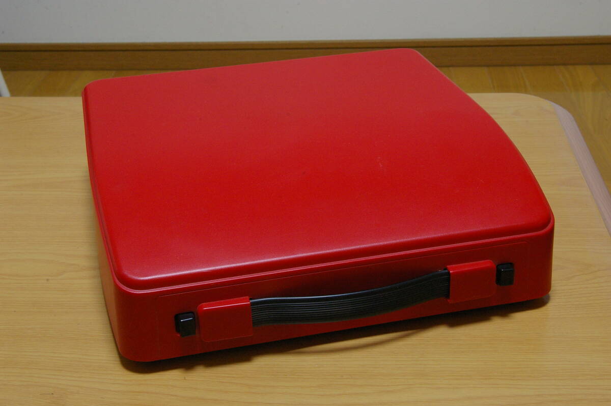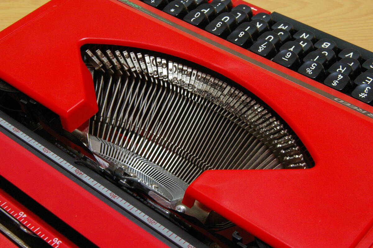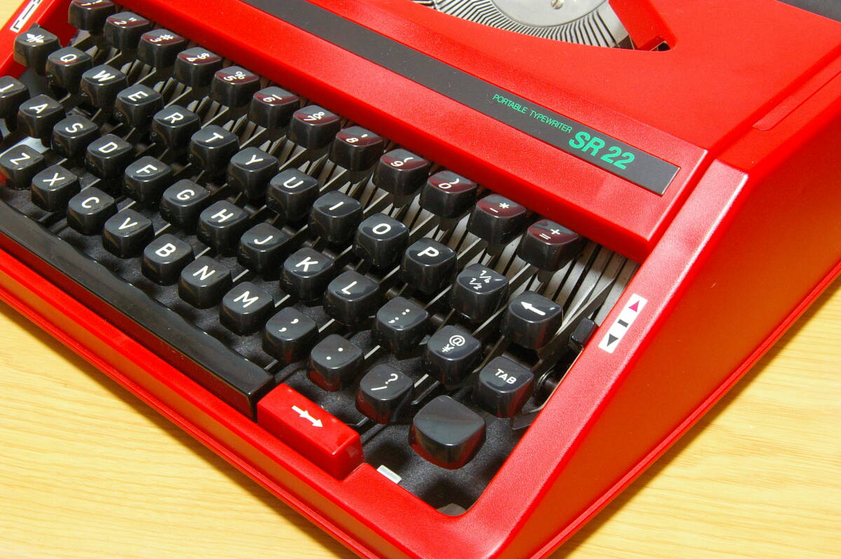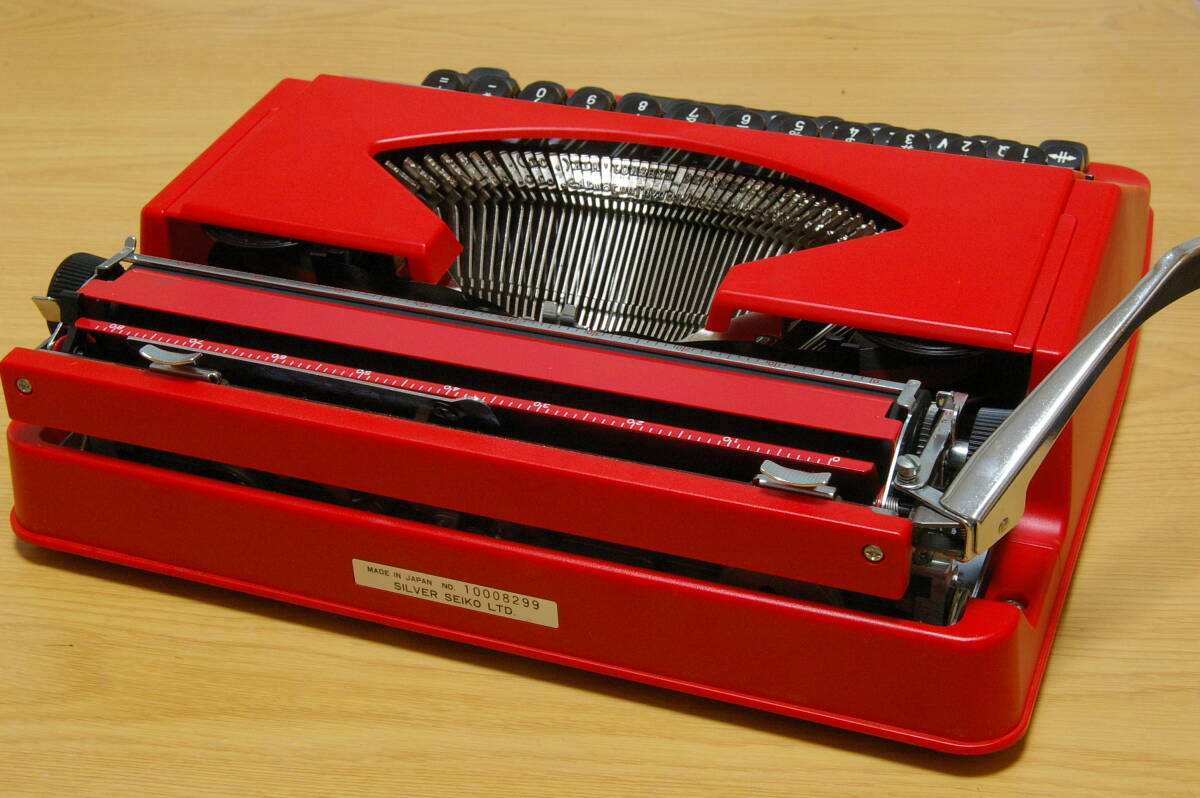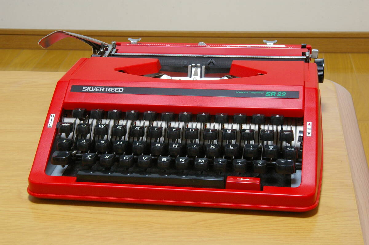 今では珍しい機械式欧文タイプライターです。色はレッドでカバー付き。カバーをかぶせると取っ手が付いていて持ち運ぶことができます。あまり使用していませんでしたが、40年近く前の商品なのでそれなりの使用感はありますのでご了承ください。