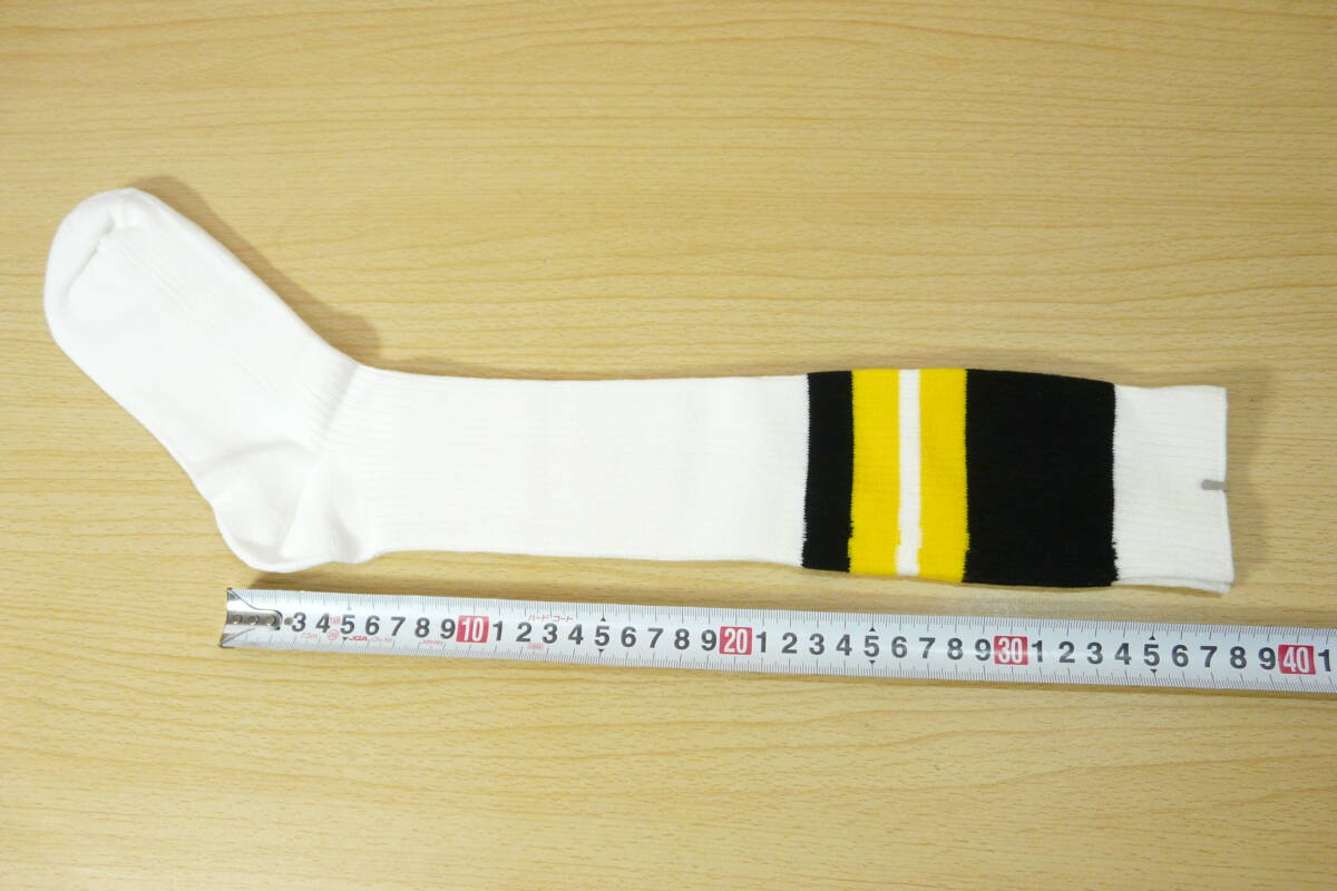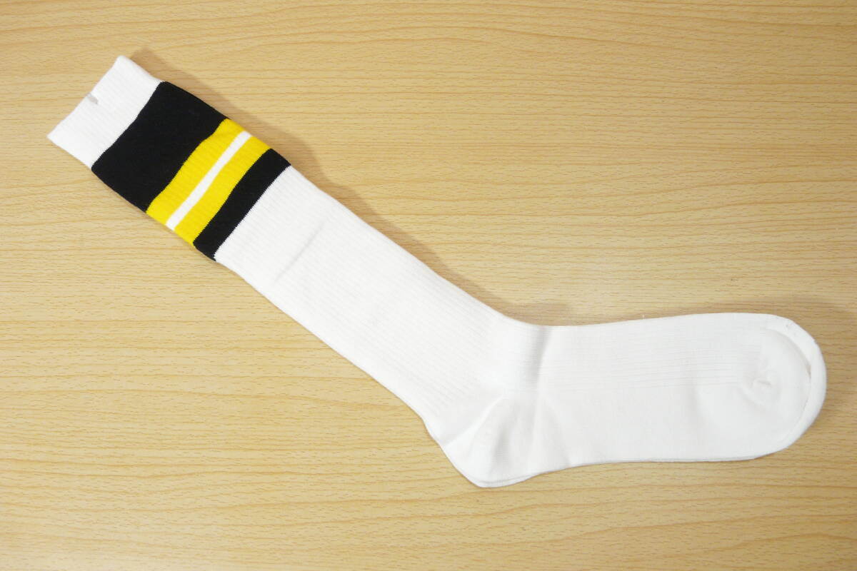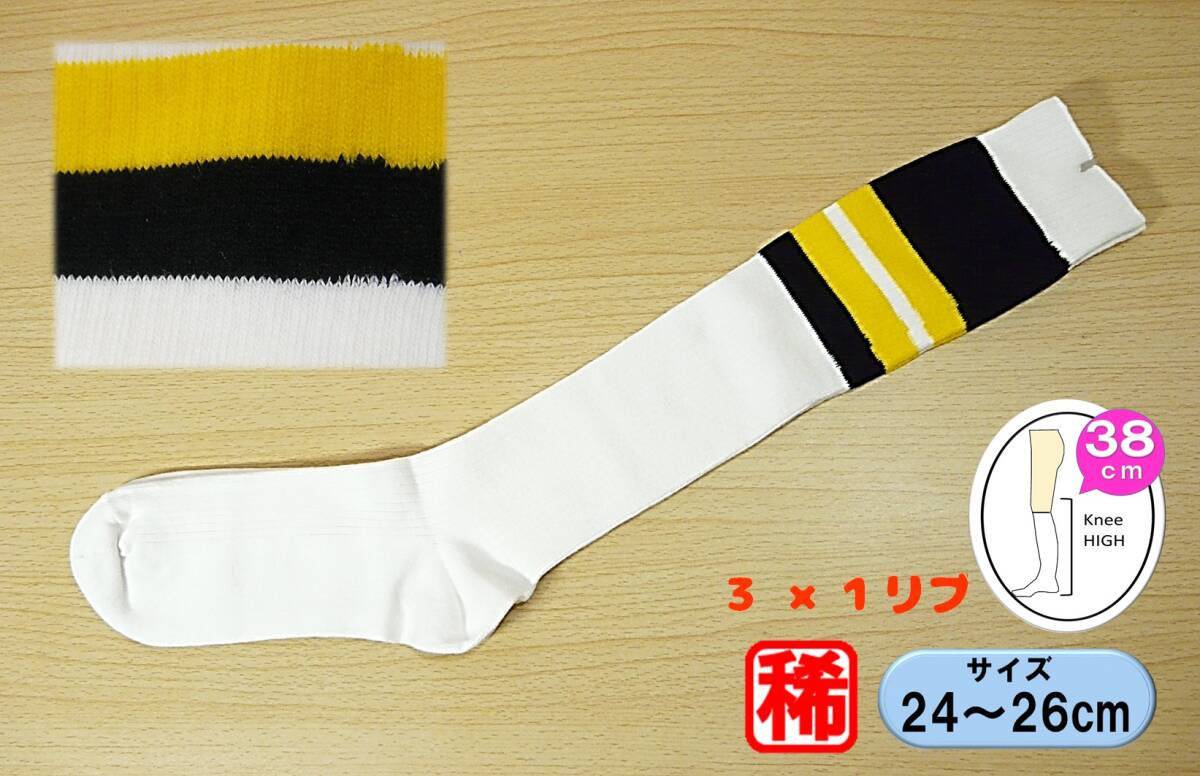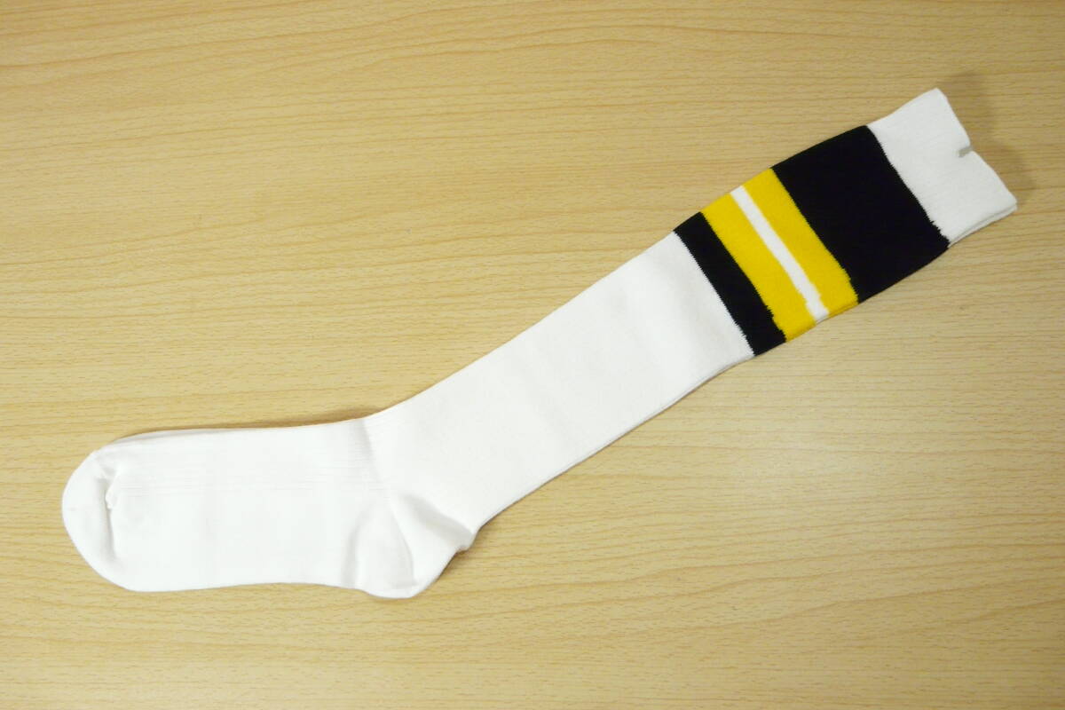 【カラー/デザイン】 ・ホワイト/イエロー・ブラック(ライン部分) ・3×1リブ ・38cm丈ハイソックス(ひざ下丈) ・くちゴムバンドなし ※写真にてご確認ください。
