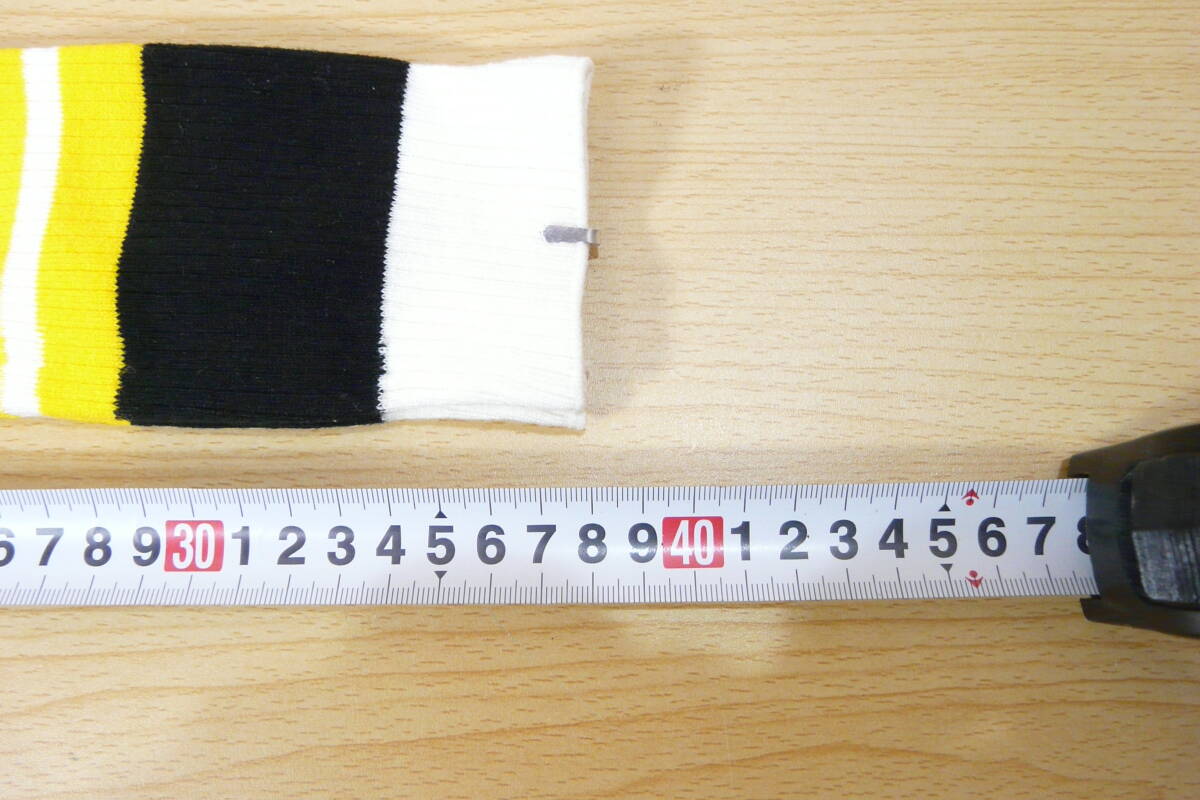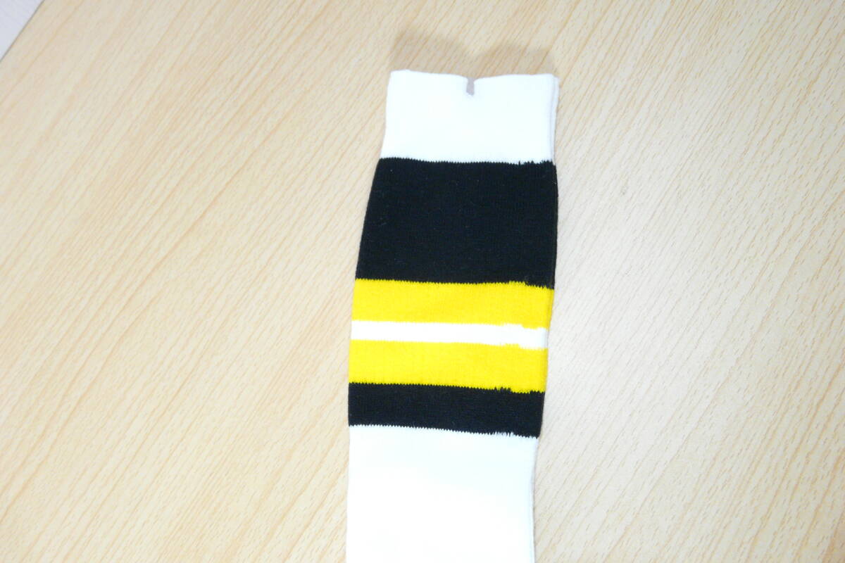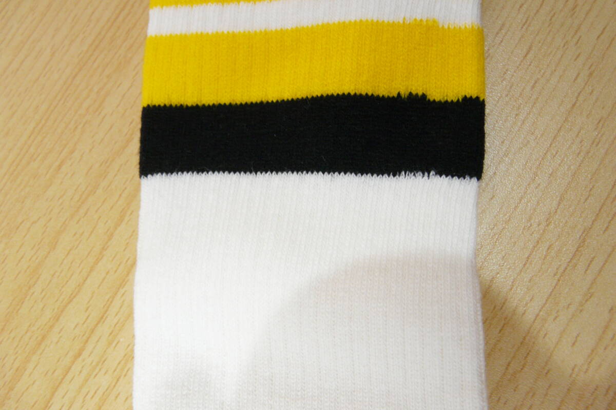 【カラー/デザイン】 ・ホワイト/イエロー・ブラック(ライン部分) ・3×1リブ ・38cm丈ハイソックス(ひざ下丈) ・くちゴムバンドなし ※写真にてご確認ください。