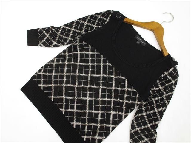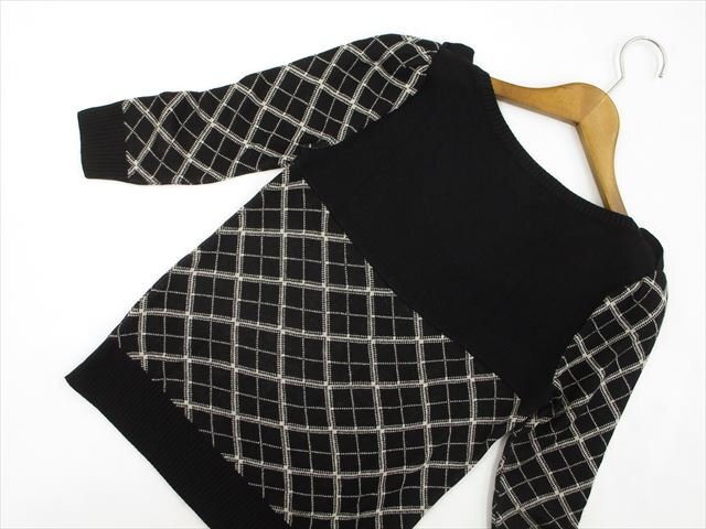 七分袖 ラウンドネック ニットカットソー M ブラック&ブラック地 アイボリー ラメ入り チェック柄