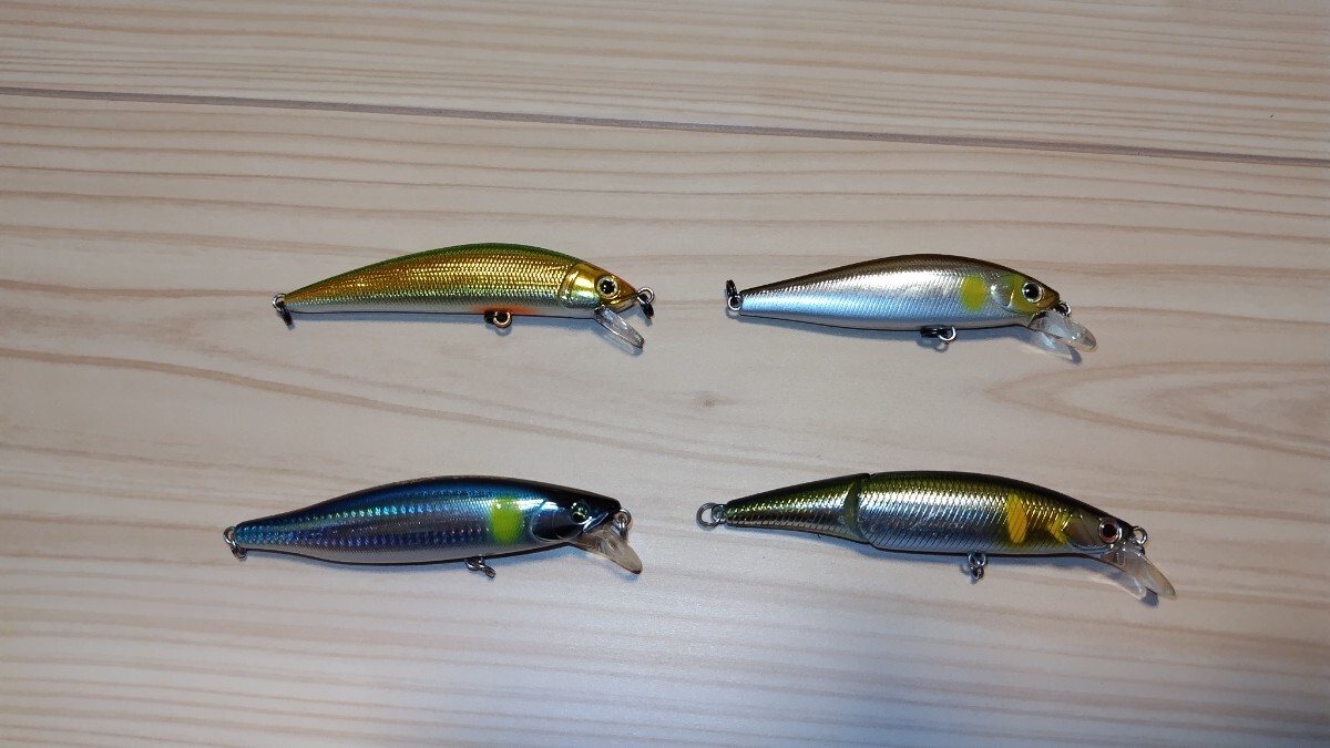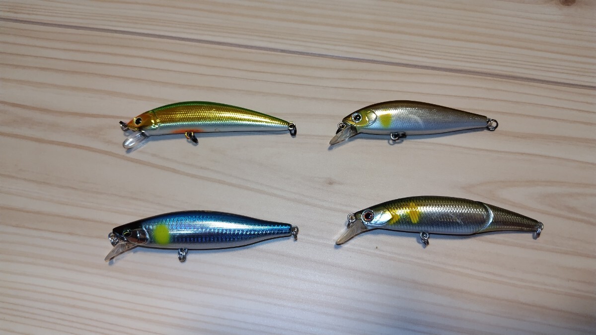 パームスのミルドレッドMRー70JS、フォレストのiフィッシュ7S、ジップベイツのリッジフラット60S、バスディのもののふ大鱒70Sとなります。