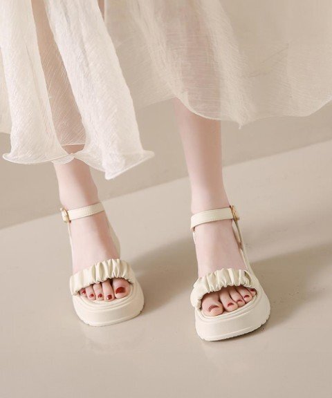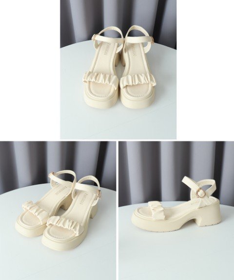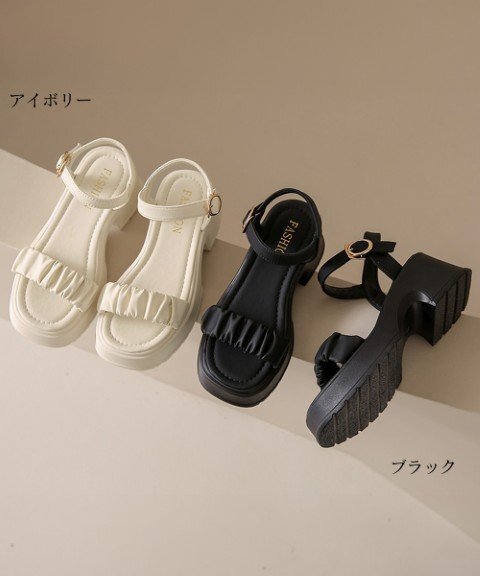 レディース アンクルストラップ チャンキーヒール スクエアトゥ ギャザー カジュアルきれいめ 大人可愛い ビーチサンダル