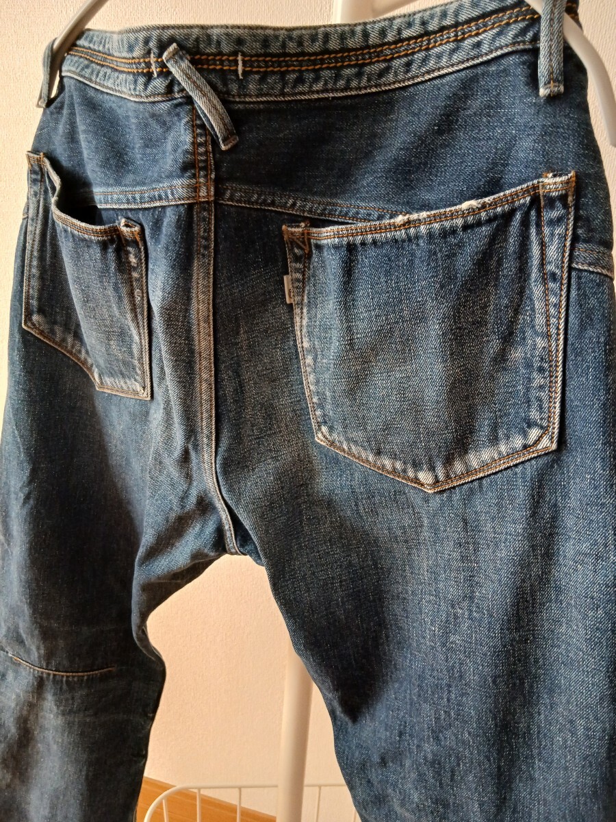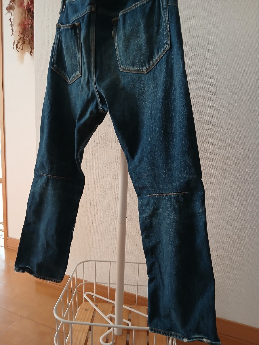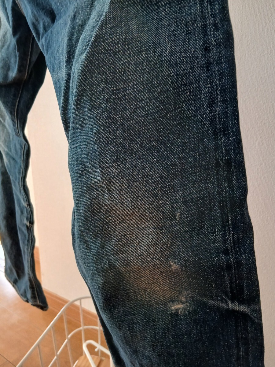 濃紺、ヒゲ 雰囲気いいです。膝には小さいダメージありタタキ入ってません。オリジナルでこのダメージがあったのかはわかりません。私が中古品購入時よりありました、
