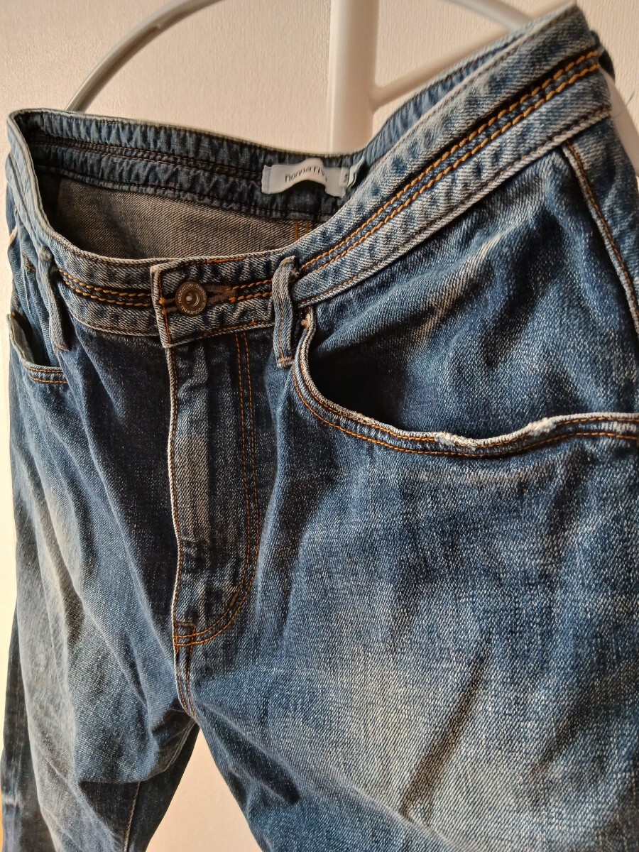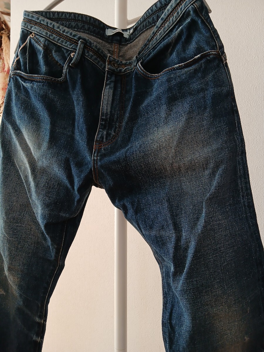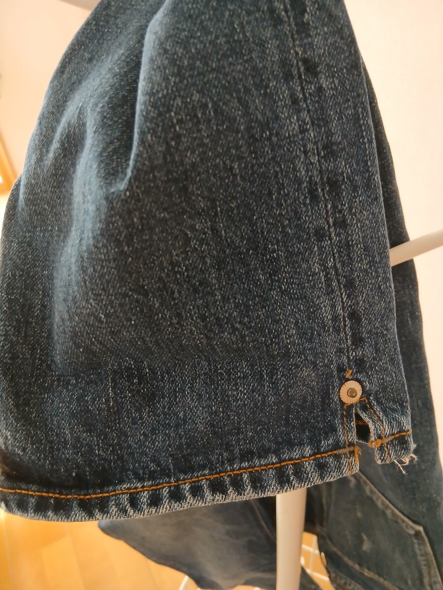 濃紺、ヒゲ 雰囲気いいです。膝には小さいダメージありタタキ入ってません。オリジナルでこのダメージがあったのかはわかりません。私が中古品購入時よりありました、