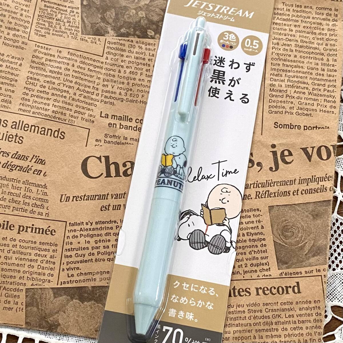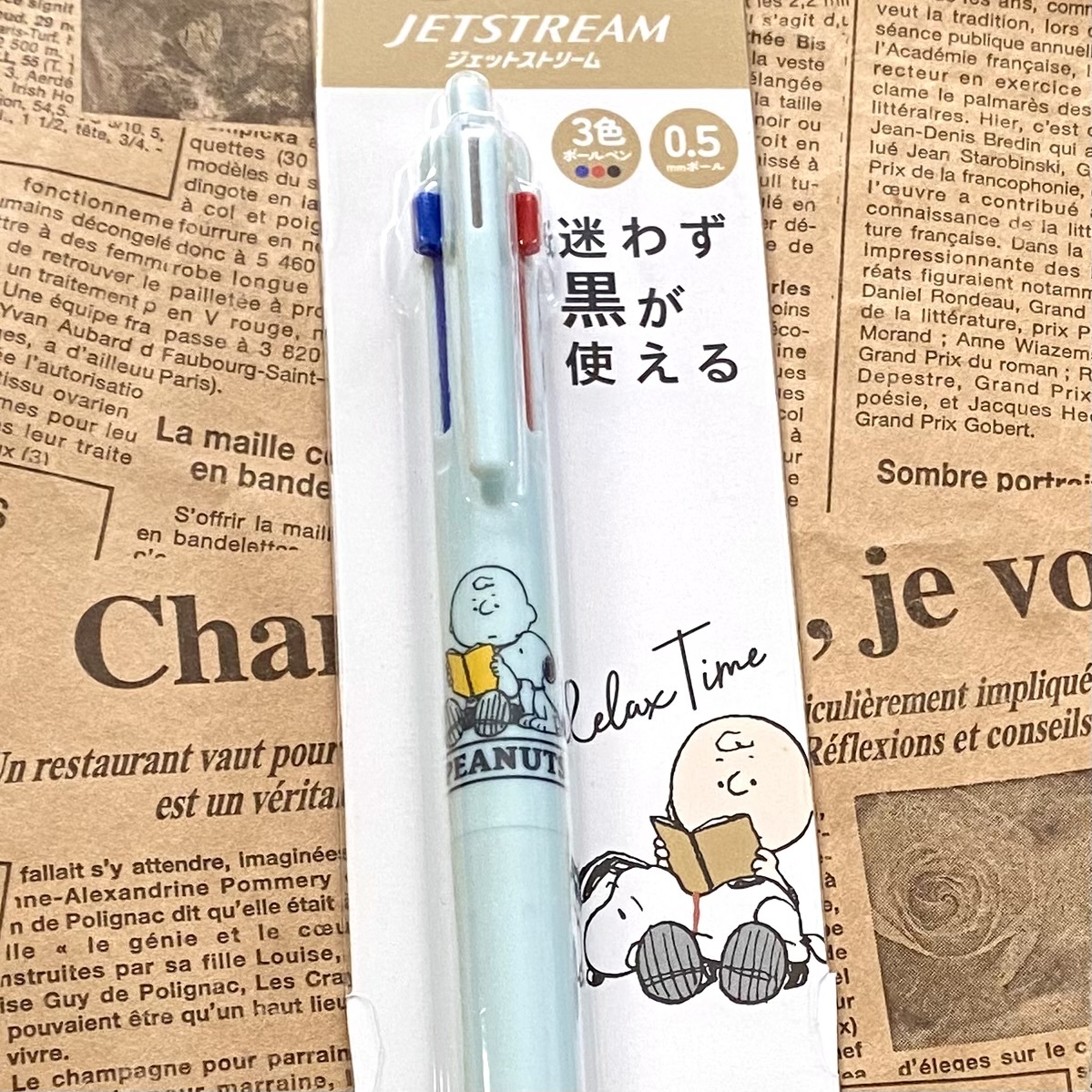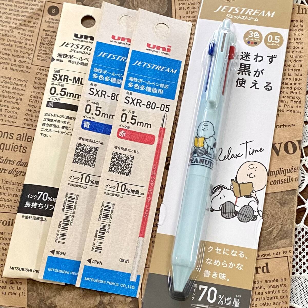 スヌーピー柄のジェットストリーム3色ボールペンと替え芯のセットです♪