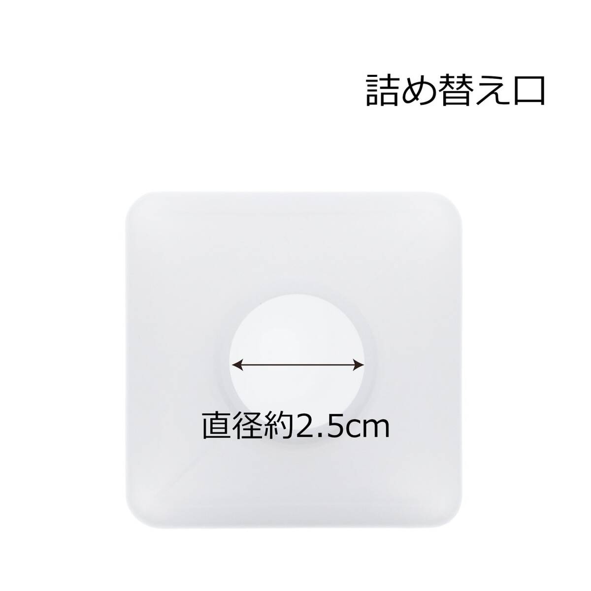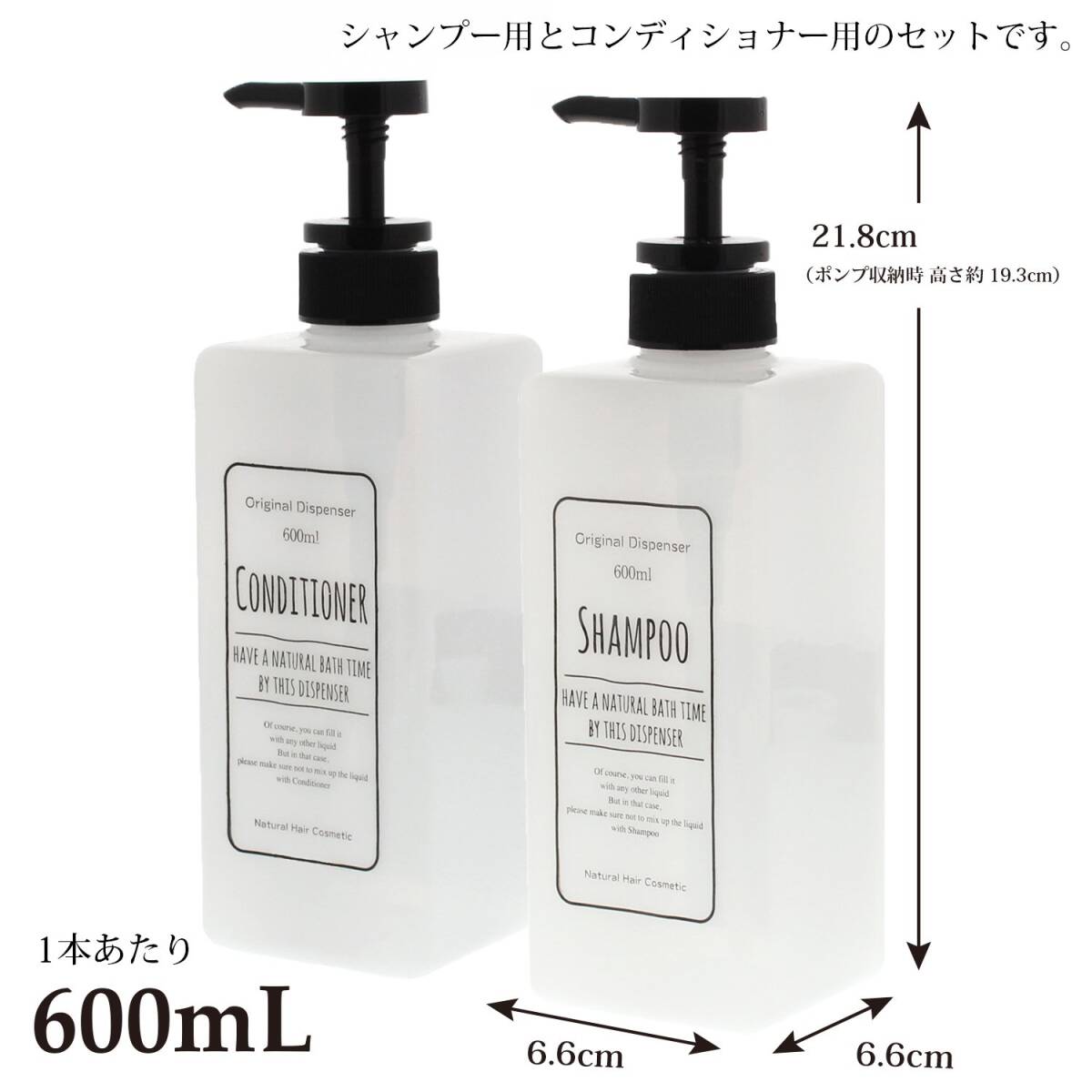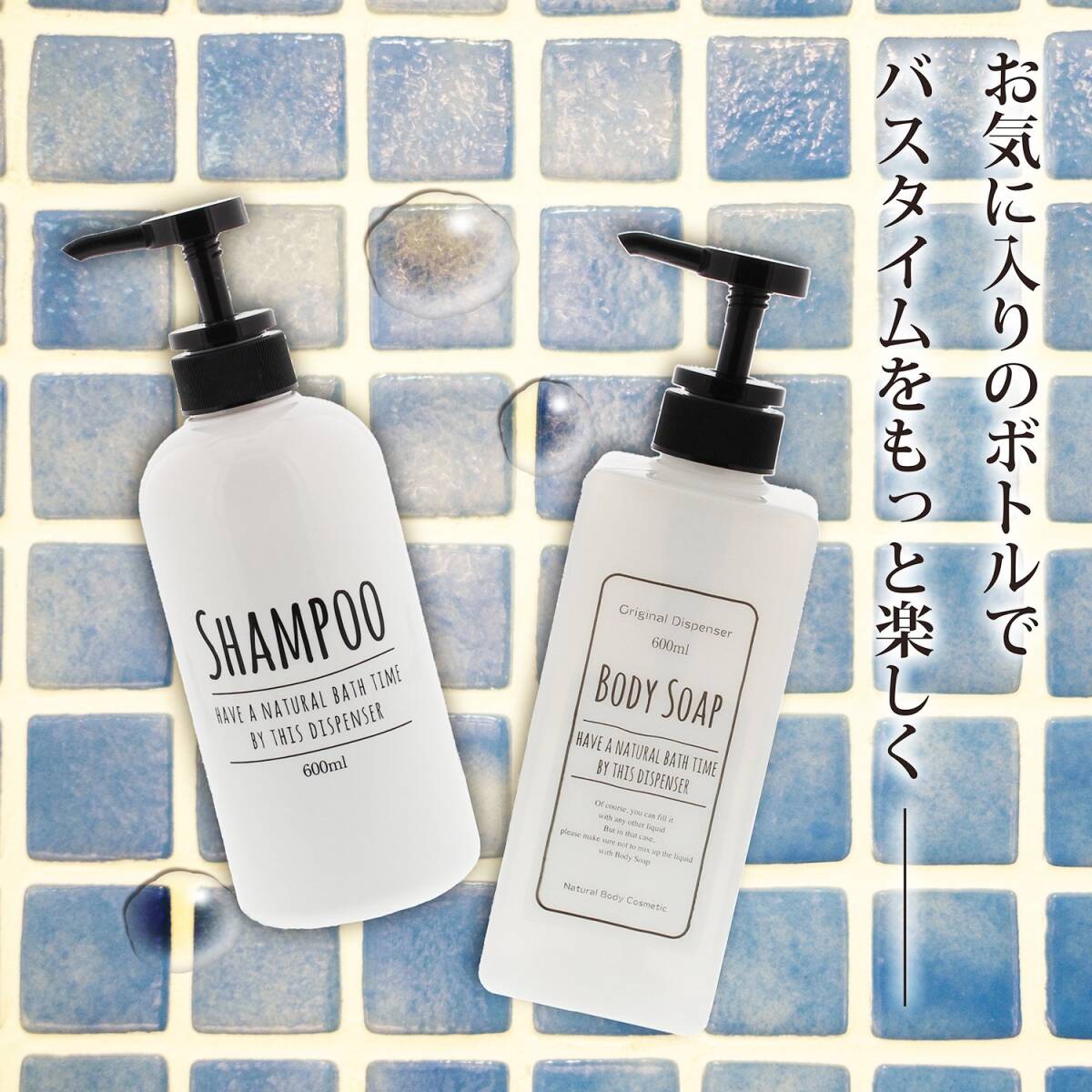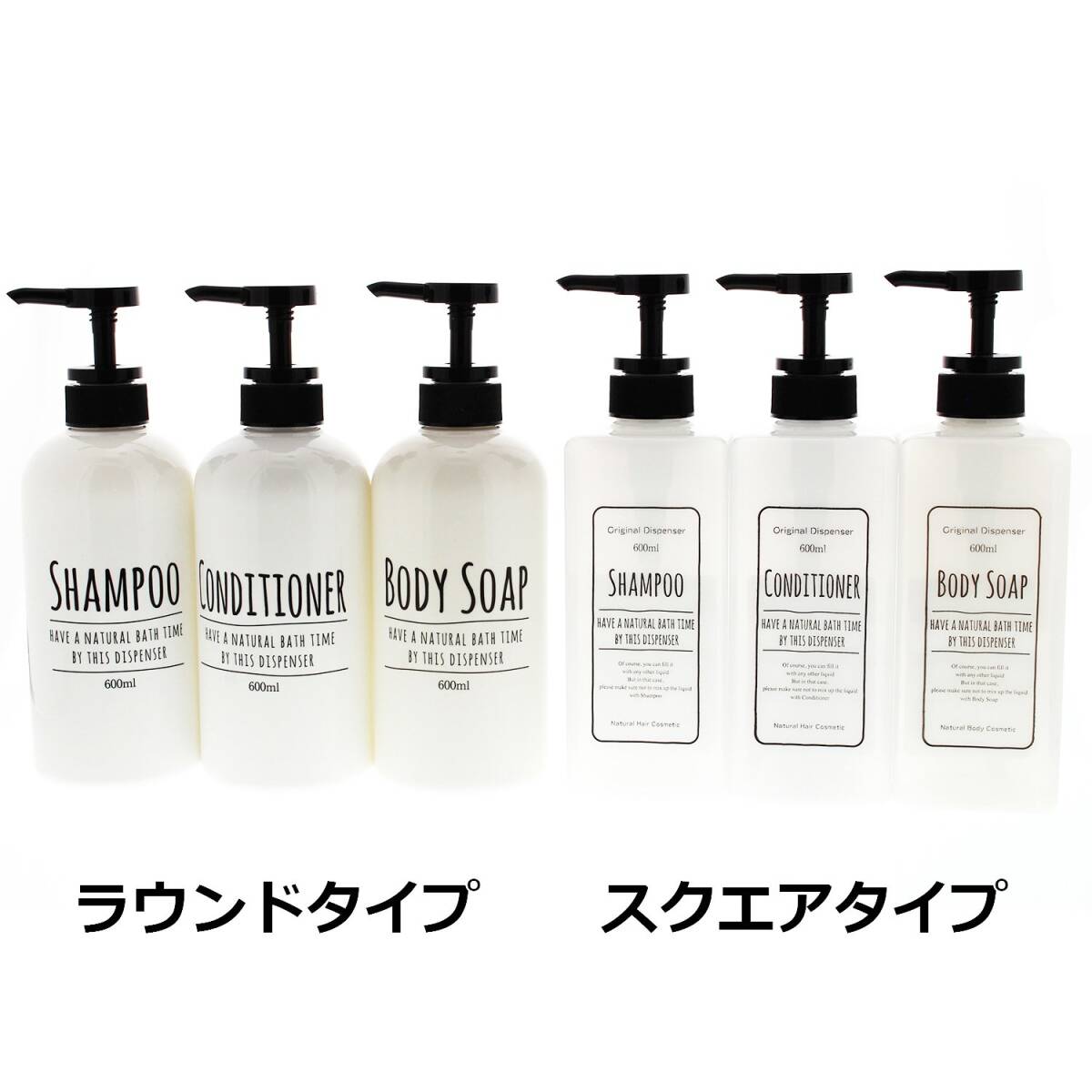 ●詰め替えるだけでバスルームがおしゃれになるディスペンサー2本組 ●「HAVE A NATURAL BATH TIME BY THIS DISPENSER」・・・お気に入りのボトルでバスタイムをもっと楽しく! ●フリーハンドで書かれたようなフォント文字が、お風呂場にちょっとした遊び心をプラス ●半透明(ホワイト)/ブラックのシンプルで清潔感あるカラーリングに、丸文字ならではのルーズ感がかわいいデザイン ●幅66mm×奥行66mmの角型ボトルなので、狭い浴室にもスッキリ置くことができる ●容量約600mlと一般的なサイズの詰め替え容器より少し大きめ ●プラスチック製なので、ガラス製と比べて割れにくく子供のいるご家庭にも安心 ●ポンプ部分は押しやすく、液体を吸い上げる部分もある程度の太さがあるため粘性の高いコンディショナーやリンスでも快適に吸い上げられる ●デザイン性にも機能性にも優れた詰め替え用ポンプボトル ●使用用途に合わせてシャンプー用とコンディショナー用をセット使い、お揃いでバスルームをコーディネート出来る ●浴室をやさしく温かみのある空間に変えてくれる、丸形「ラウンド」シリーズの取り揃えもあり ●※酸性、および石油類・除光液・香水・アルコール成分の含まれるもの(トニック・コロンなど)を入れることはできません。また、粘度の高い液体や、粒状のものが混ざっている液体等には使用できません ●※樹脂の特性上、ご使用になる中身の成分により劣化や破断することがあります。成分をご確認の上でご使用ください。不具合が出た場合は、すみやかに他の容器に移し替えてください ●※溶液を入れたまま長時間放置すると、内容物の変色やボトルに着色することがあります。また樹脂が変色することがあるため、漂白剤に長時間つけ置きしないでください ●※たわし等の強い素材やクレンザー等の研磨剤で磨くと傷がつきます