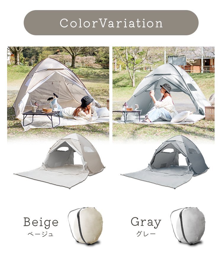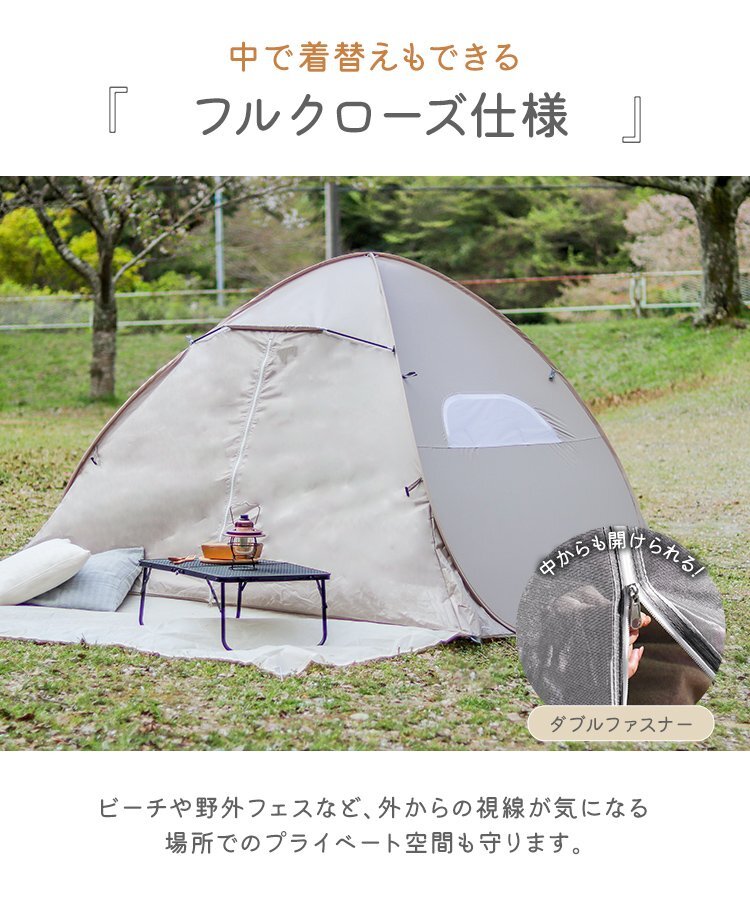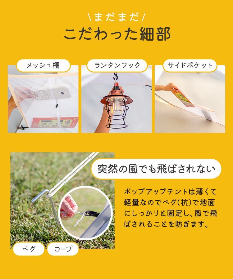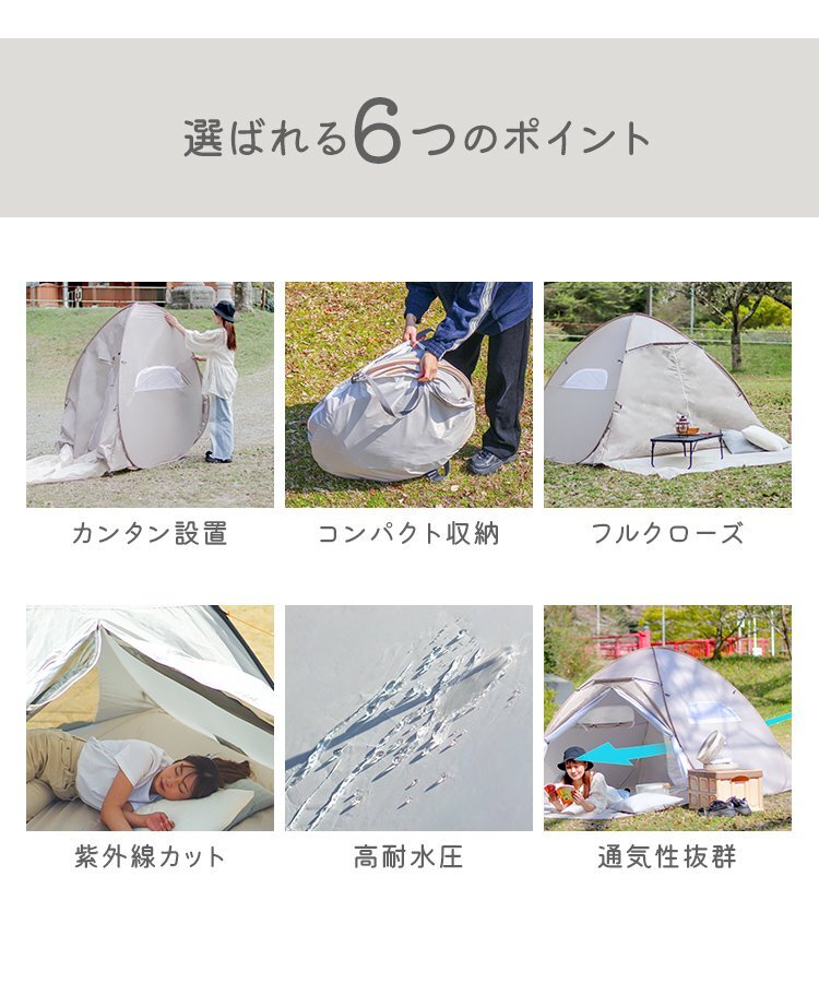 \超ワイド200cm ポップアップテント/ 広々スペースで家族や友人とアウトドアを快適に楽しめます。 最高値紫外線カット率。日差しが強い日もしっかり肌を守ってくれます。 入口にサンシェードを付けることで、日陰の面積がアップ! 大きなメッシュ窓が風を通しながら、虫の侵入も防ぎます。 ダブルファスナーで中からも外からも開閉OK! フルクローズだから簡単にプライベート空間完成。 透けにくい生地で、着替えや授乳にも安心してお使いいただけます。 シルバーコーティングで急な雨にも安心。高い遮光率と遮熱率で、熱中症対策としても◎ リュックのように背負えて肩掛けにもなる2WAY収納バッグ付きで持ち運びもラクラク。 ランタンフックとメッシュ天井棚、両サイドには収納ポケット付き。 【商品詳細】 カラー:ベージュ 素材:190Tポリエステル(シルバーコーティングUPF50+) メッシュ:ポリエステル100%、天井フック:PP、日さしパイプ:D6.9mmグラスファイバーポール サイズ:(約)幅200×奥行280×高さ135cm(フロントシート含) 重量:(約)2.6kg 耐水圧:1200mm |