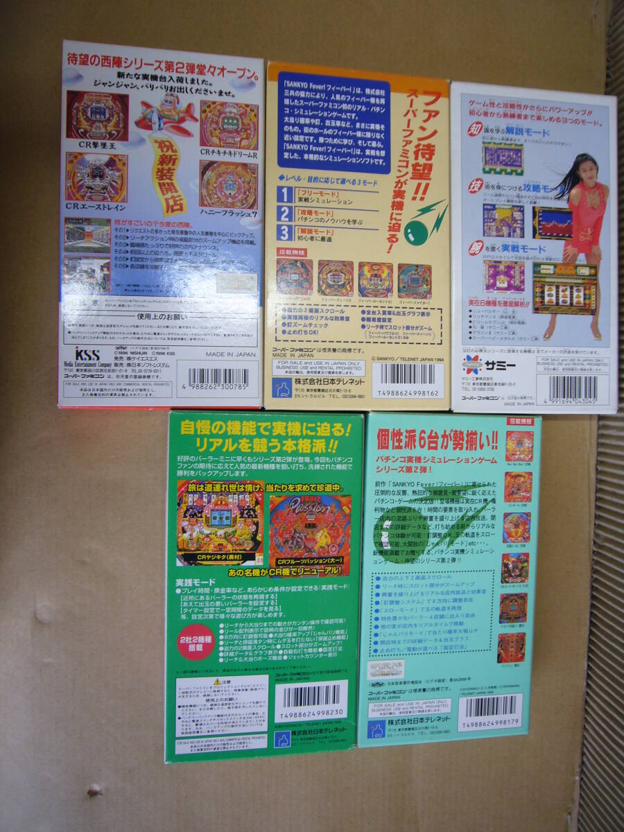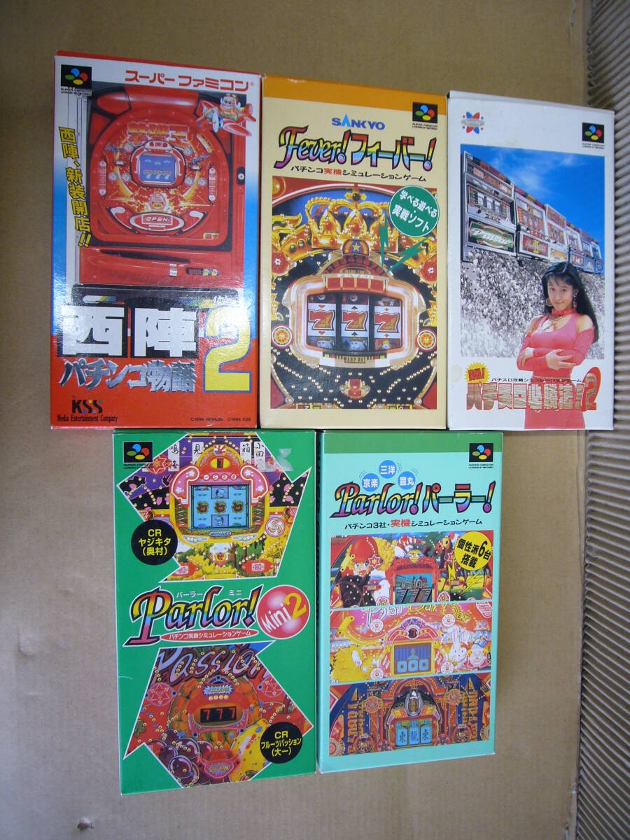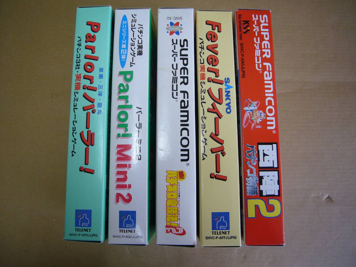 ■スーパーファミコンソフト<パチンコ系5種>5箱で!パーラー!Parlorミニ、パチスロ必勝法2、フィーバー!西陣2#任天堂 #当時物