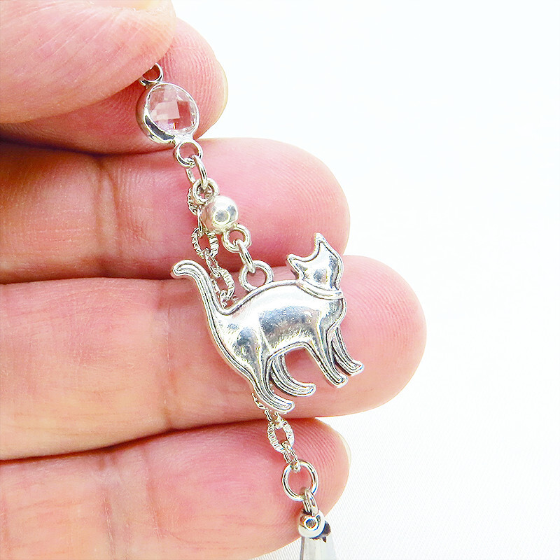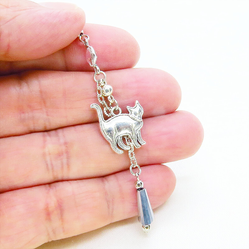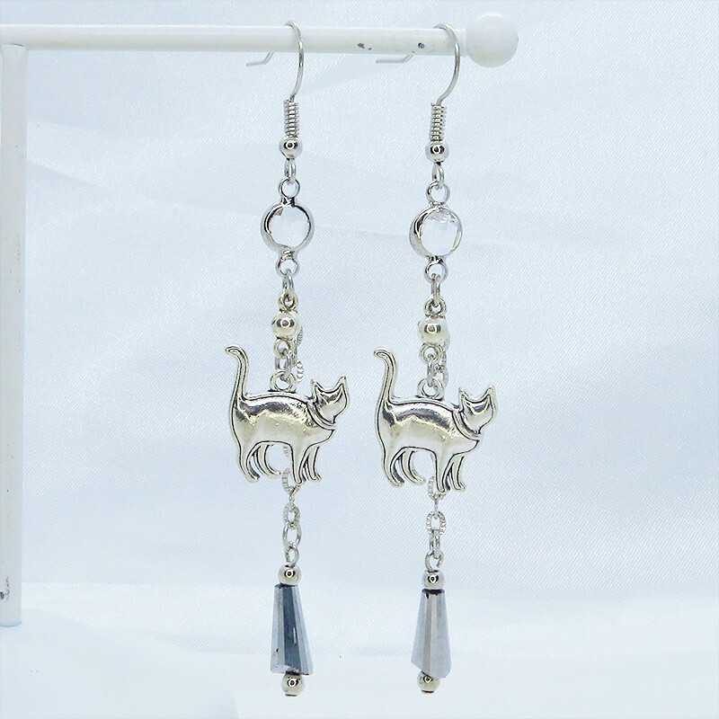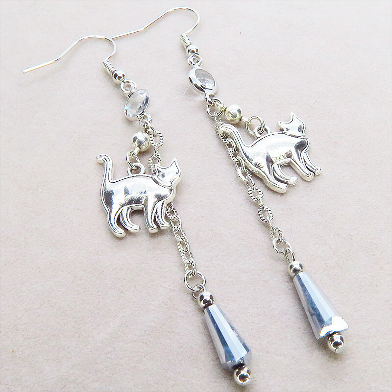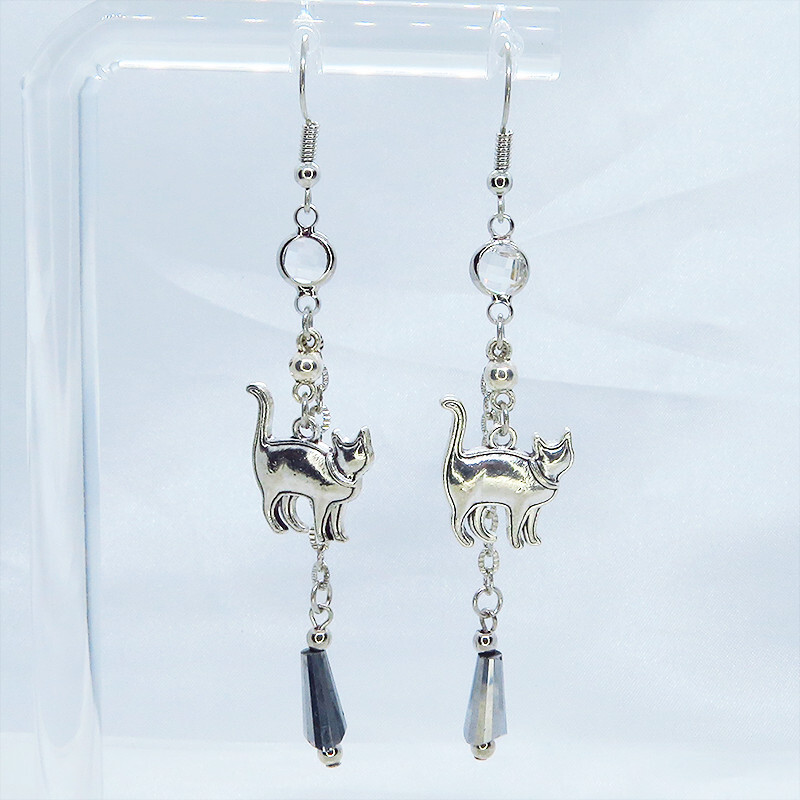 アンティークシルバー 歩き猫シルエットモチーフの大人可愛いチェーンピアス ラインストーン サージカル可