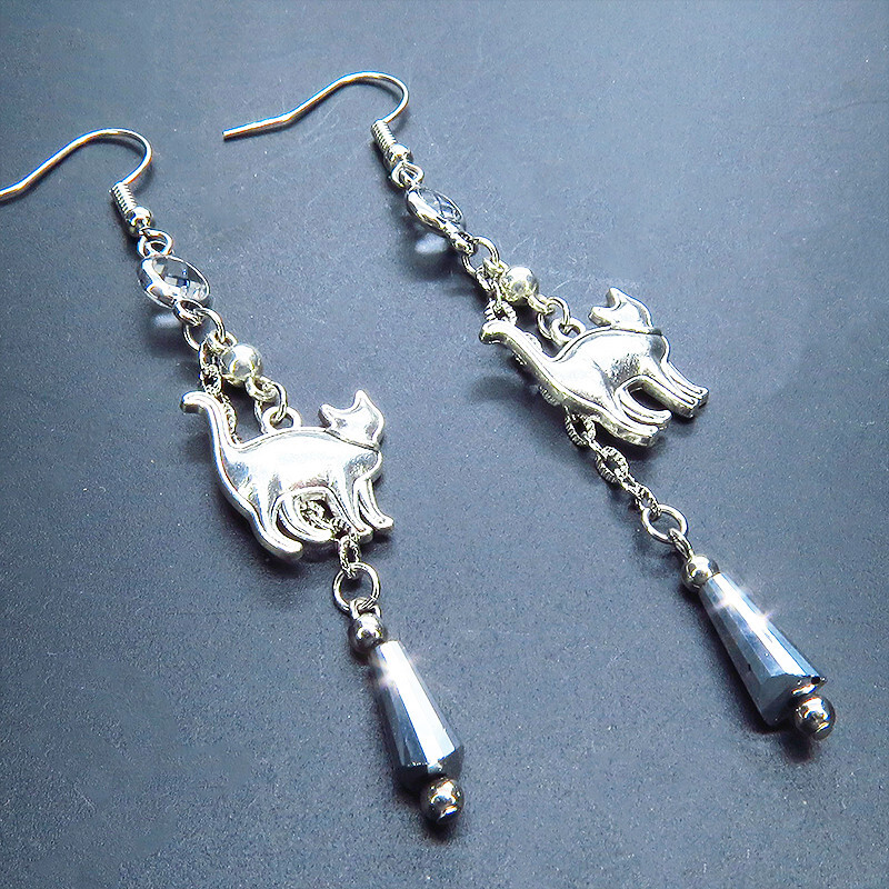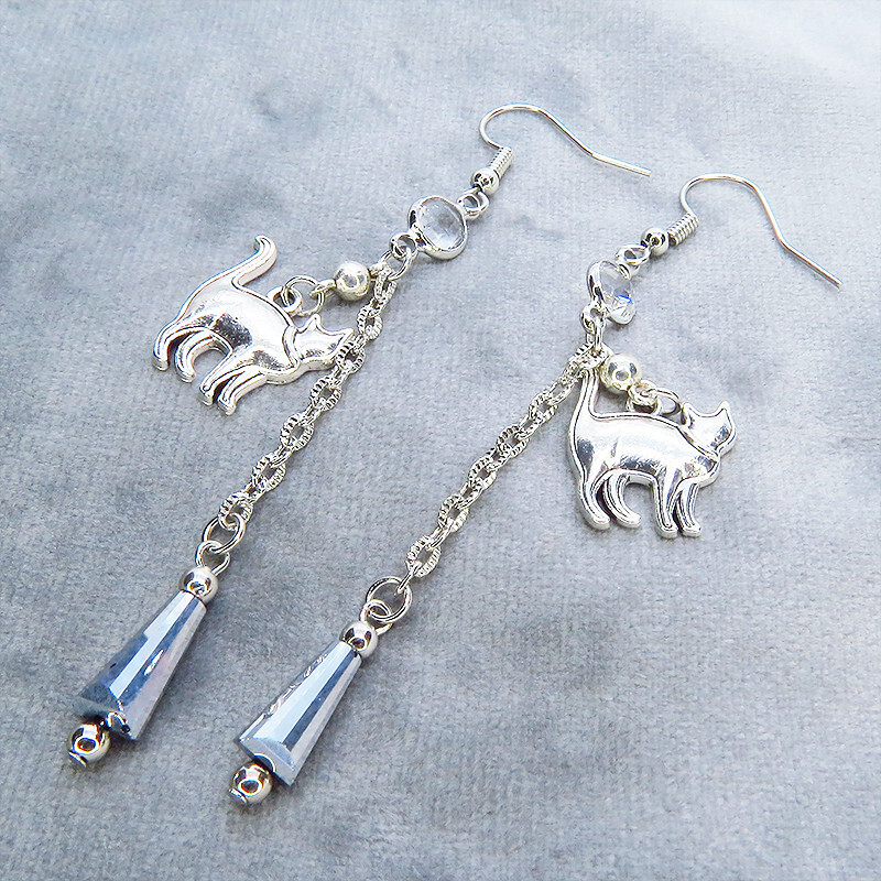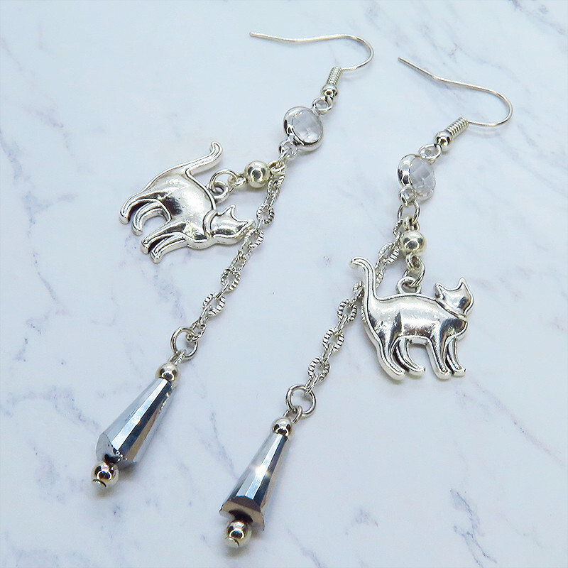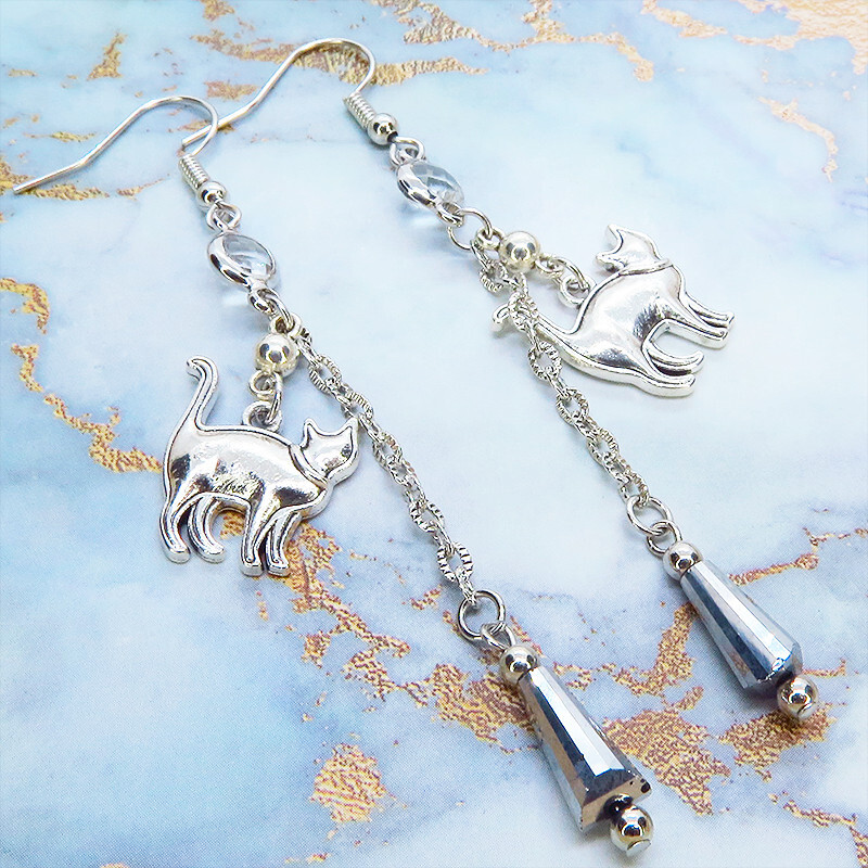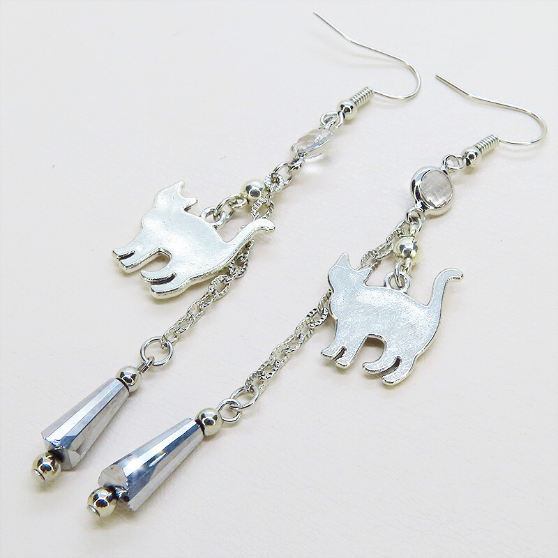 どこか懐かしいアンティークな雰囲気が漂うシルバーカラーの猫シルエットが印象的なチェーンピアスです