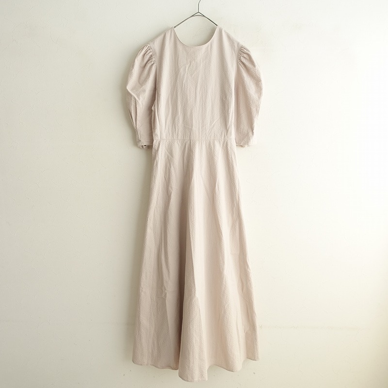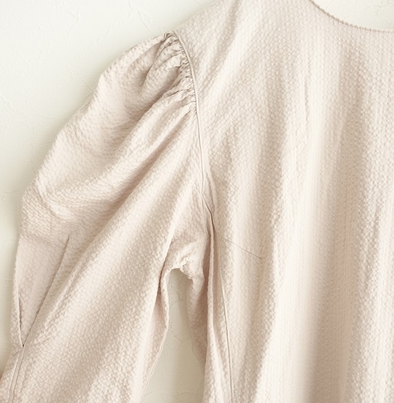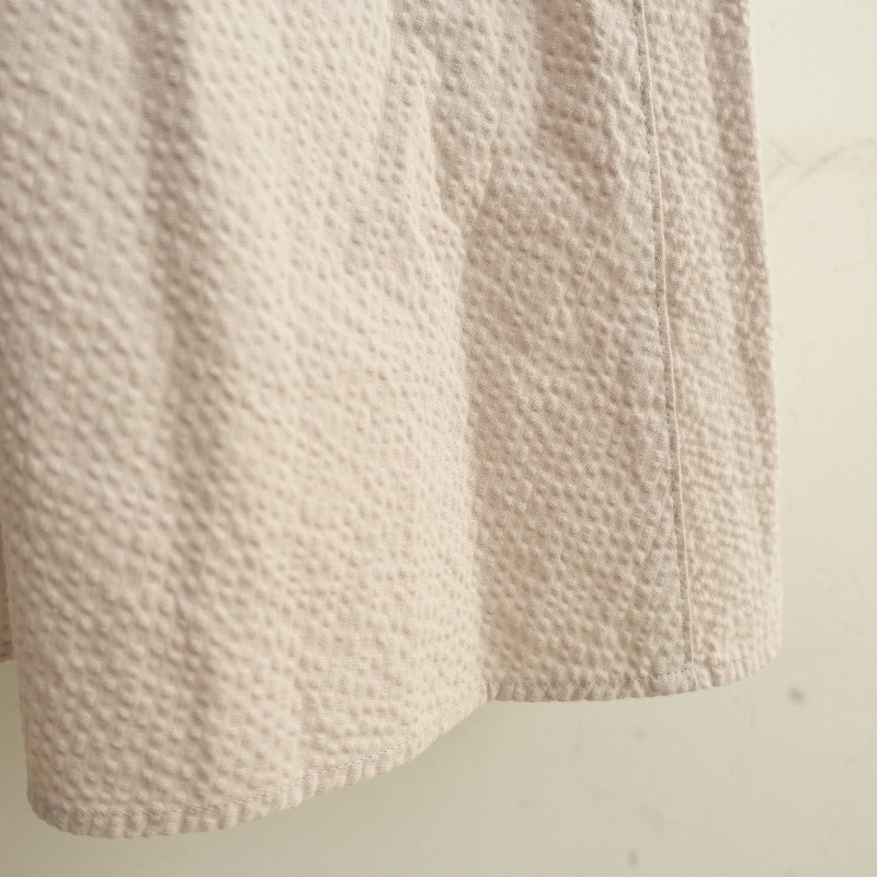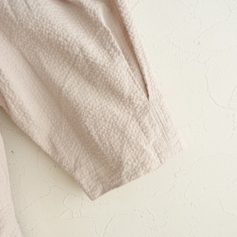 | IENA×Takako Shirasawaのコットンサッカーフレアワンピースです。カラーはくすんだベージュピンクで、ハリとシボ感のあるサッカー素材です。フロントセンターファスナー&スナップボタン開閉式で、前立てに飾りボタンがあしらわれております。袖山にギャザーと袖口にインバーテッドタックが施されており、左右ウエストにシームポケットがございます。定価(メーカー希望小売価格)26400円の商品です。 |