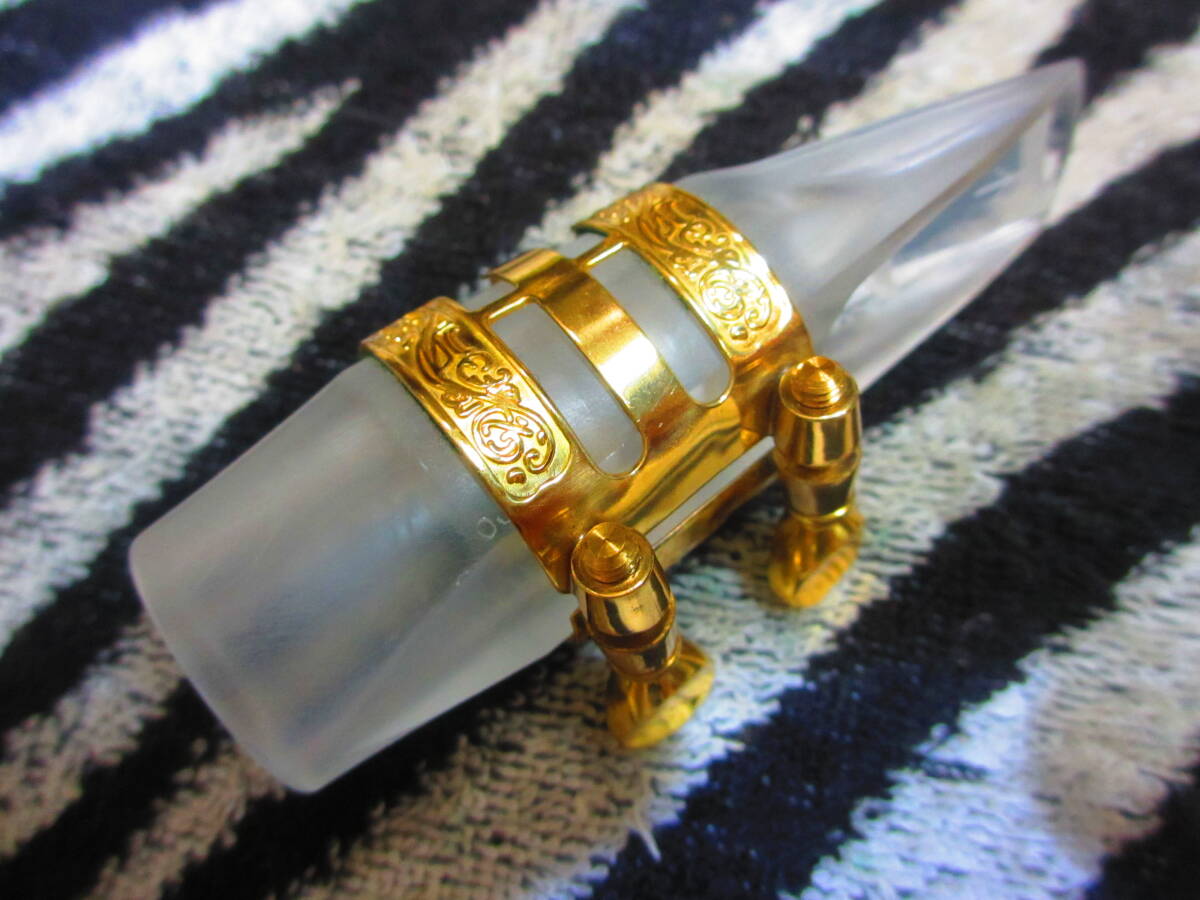 ・オリジナルブランドの美しいマットクリアーアクリル(ハンドメイド)のマウスピースにオリジナルパワープレートをカスタマイズし、さらにオリジナルブランドリガチャー(彫刻入り、ヘビースクリュー、GL仕上げ)をセットしました。(試奏チェック済み、未使用)