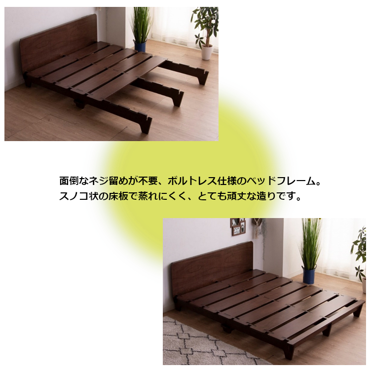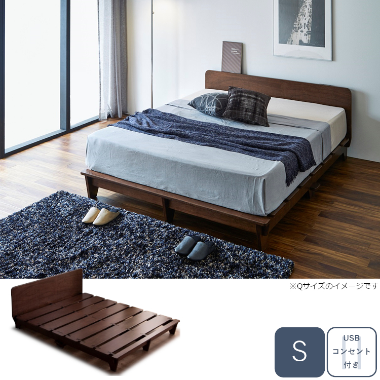 面倒なネジ留めが不要なボルトレス仕様のベッドフレームです。シンプルなデザインながら、便利なUSBジャック付2口コンセントや”ちょい宮”が付いて、機能性も優れています。耐久性も抜群、おススメのベッドフレームです。