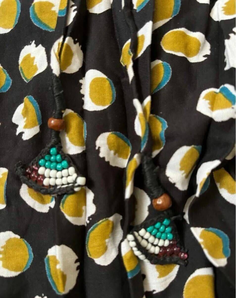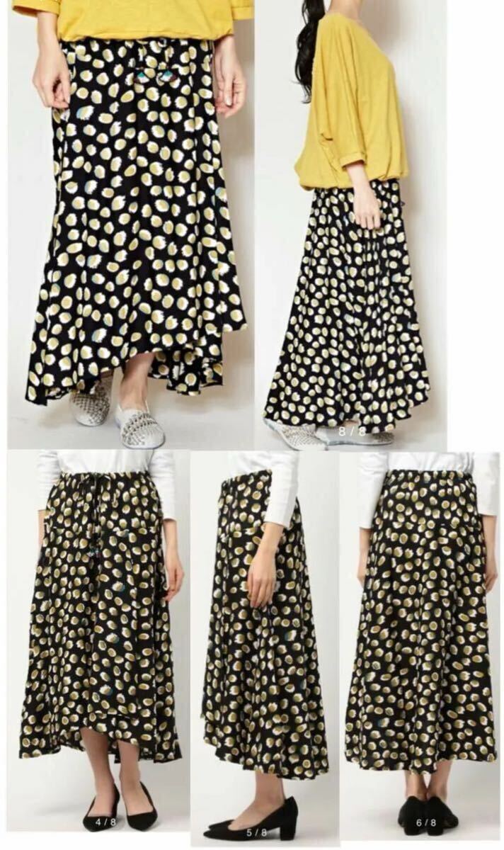 東アフリカの連続柄プリント『キテンゲ』から発想したドット柄が新鮮!ひらひらと重なるデザインの裾が華やかなスカート。女性らしさを演出してくれるキレイなシルエットです★ウエストストリングのビーズ使いもポイント♪・