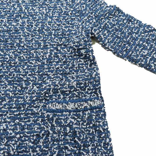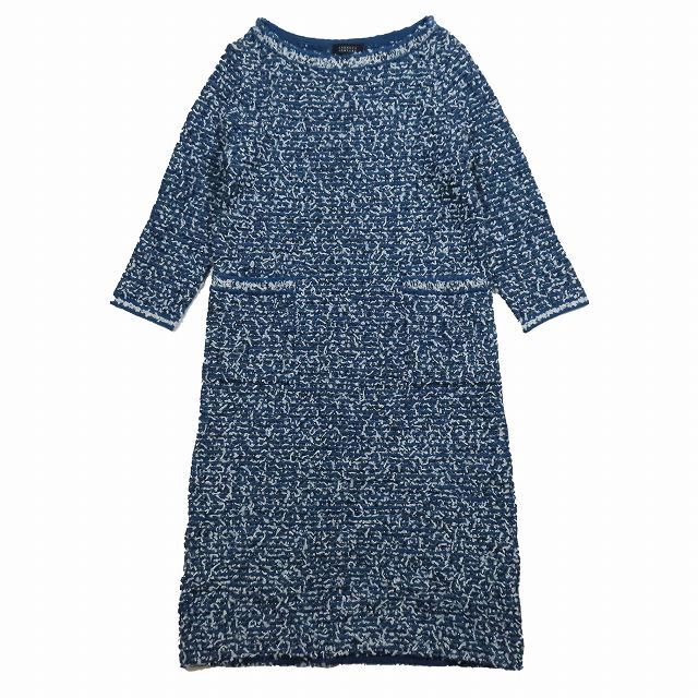 バーニーズニューヨーク BARNEYS NEW YORK ボートネック ツイード ワンピース ひざ下 7分袖 ブルー サイズ36 レディース YBA9