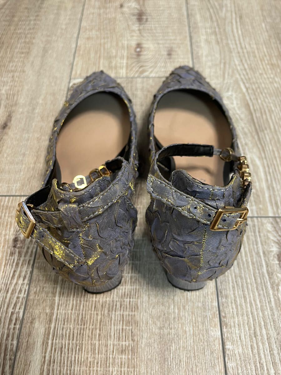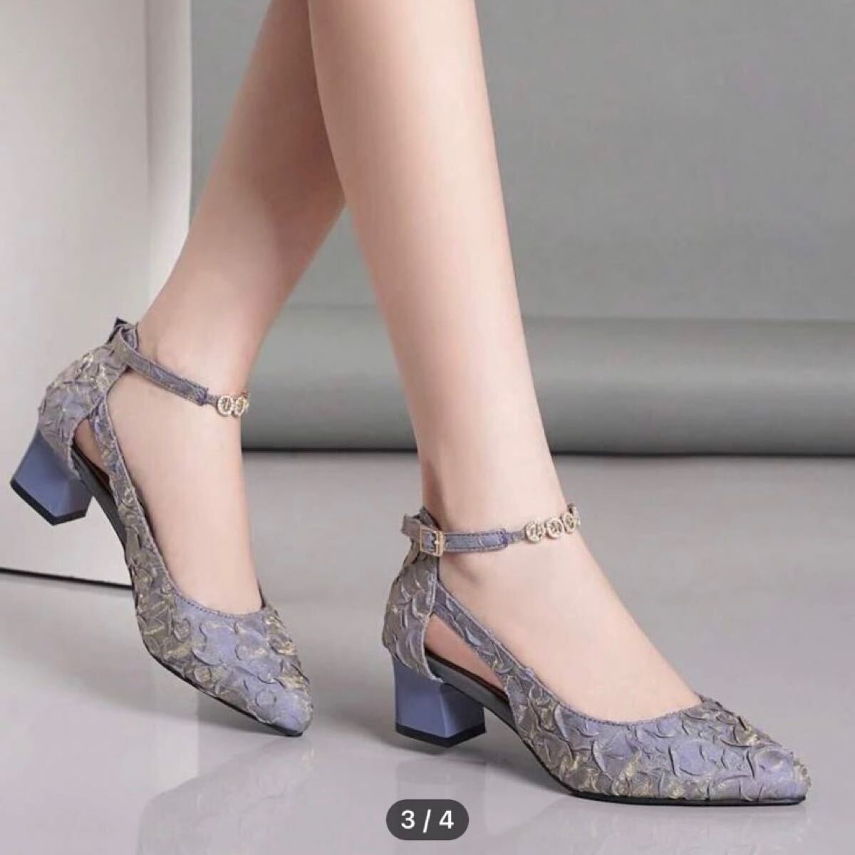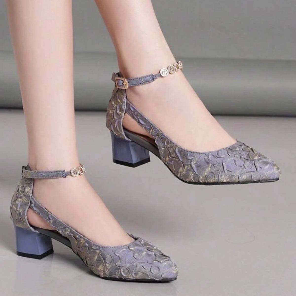 ラインストーンデコレーション ポイントトゥ チャンキーヒール アンクルストラップ パンプス