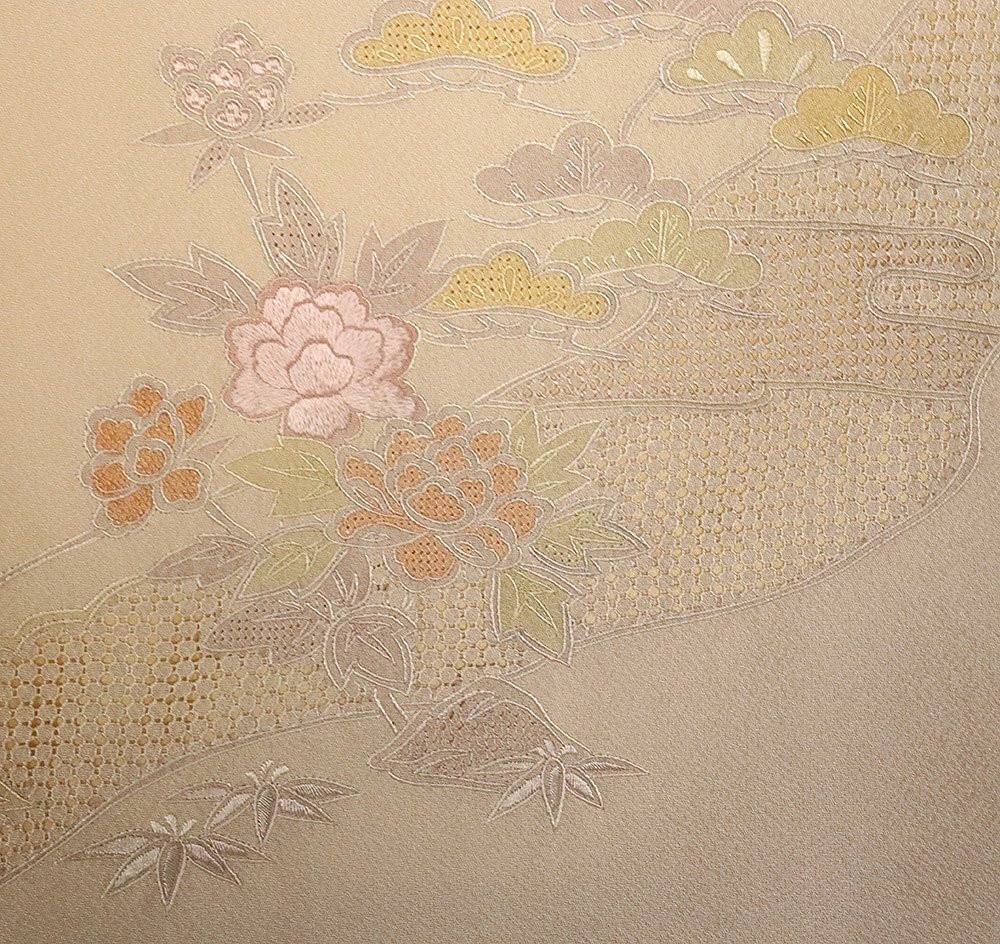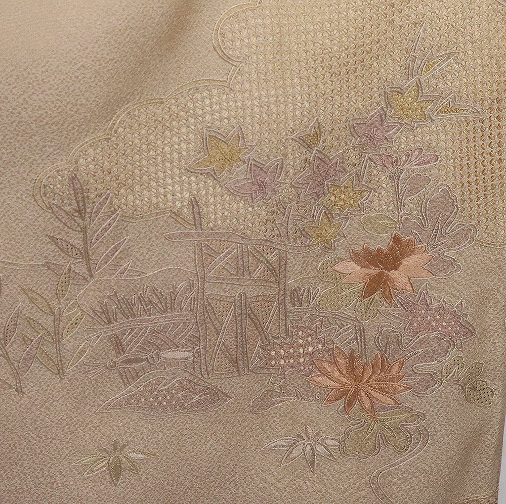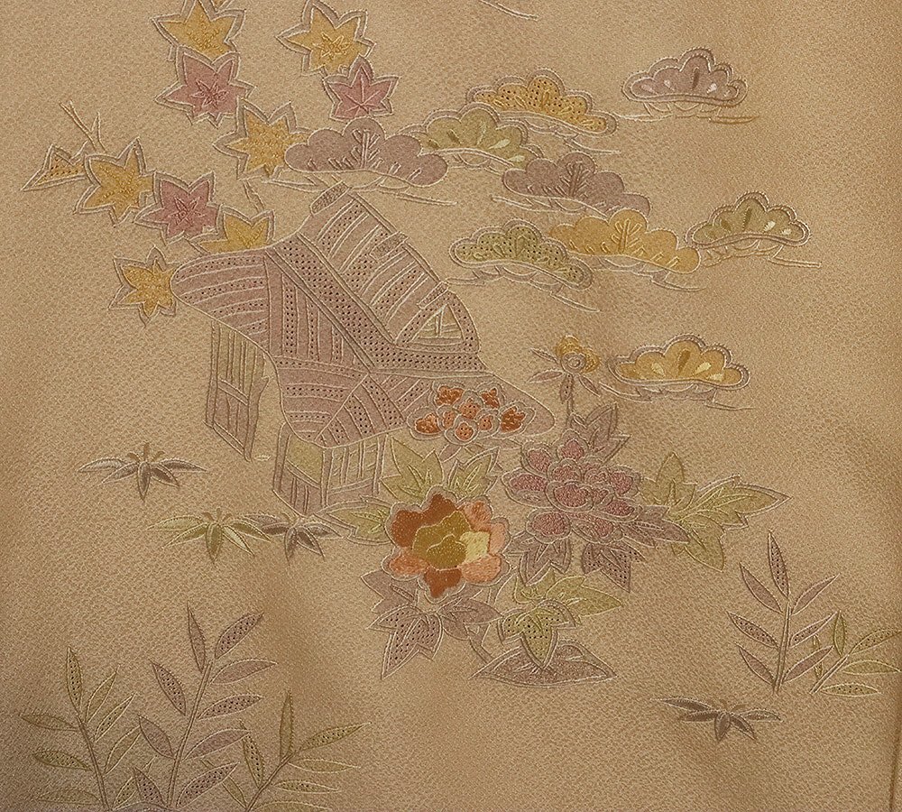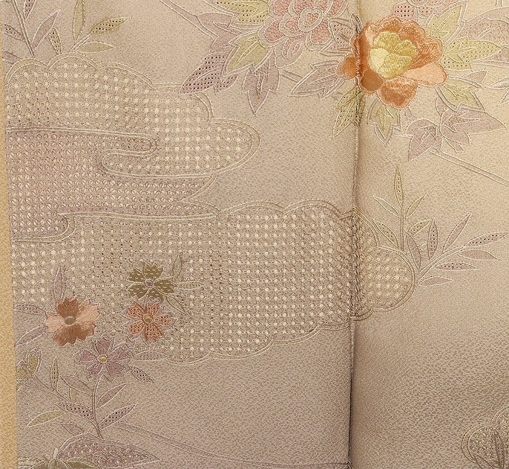 | 色・柄 | 訪問着 袷 丹後縮緬地 オレンジ・小豆色暈し地 刺繍・茶屋辻・松竹梅・牡丹・菊・紅葉 ドロンワーク刺・雲 (写真では上手く色が出ない場合があります。ご了承下さい) |