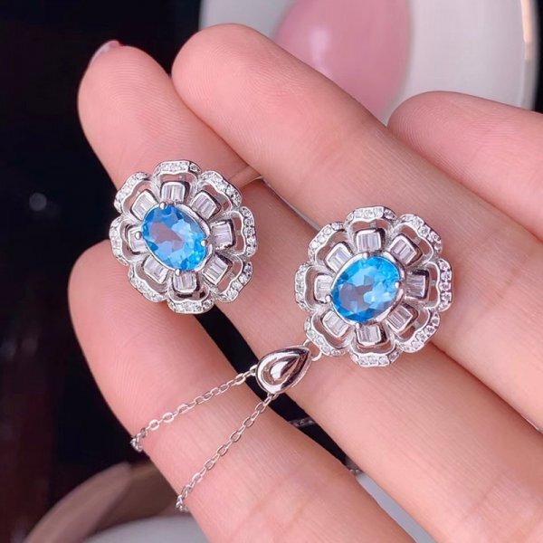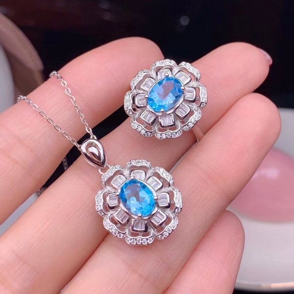 天然トパーズジュエリーセット(ネックレス、リング)、6x8mm、925シルバー