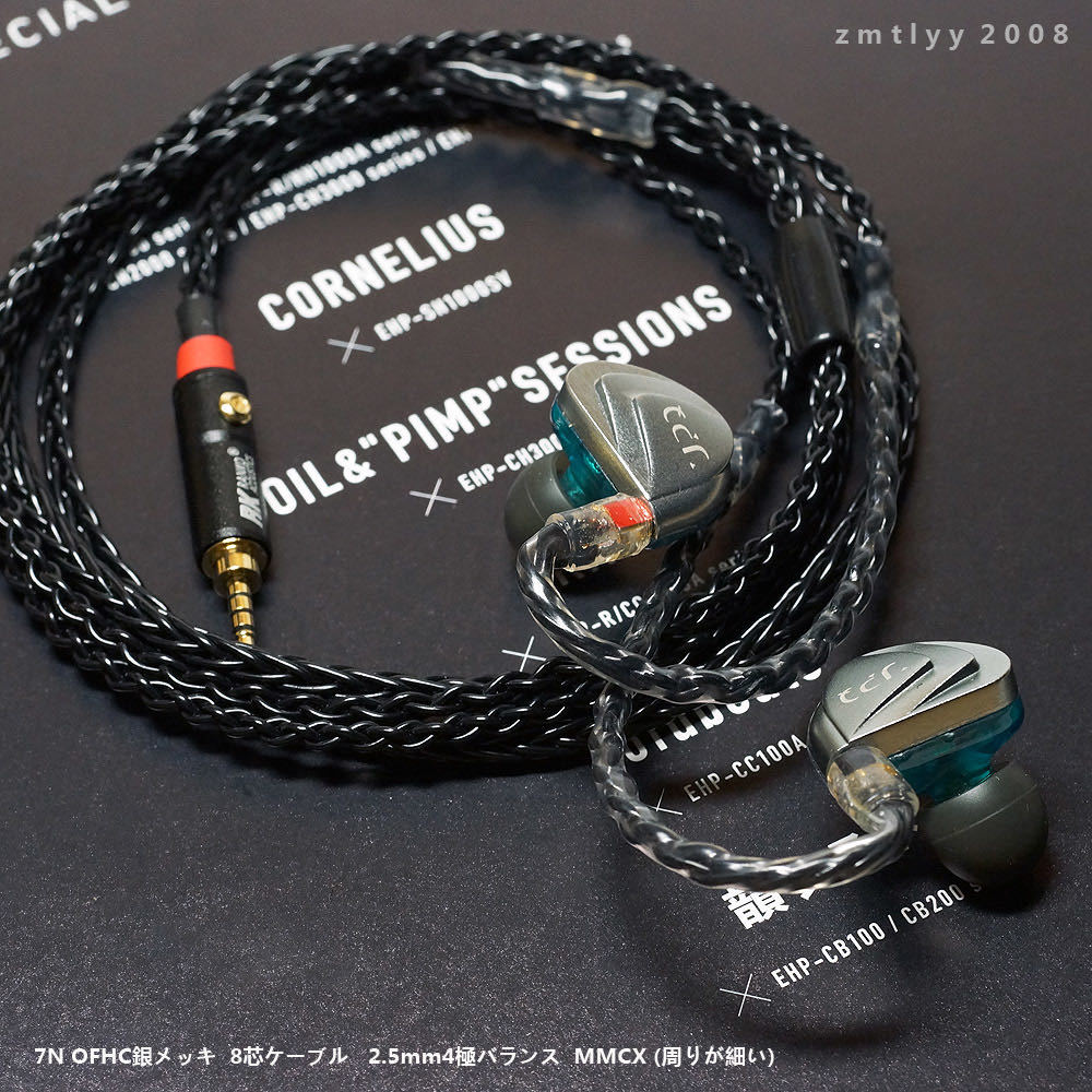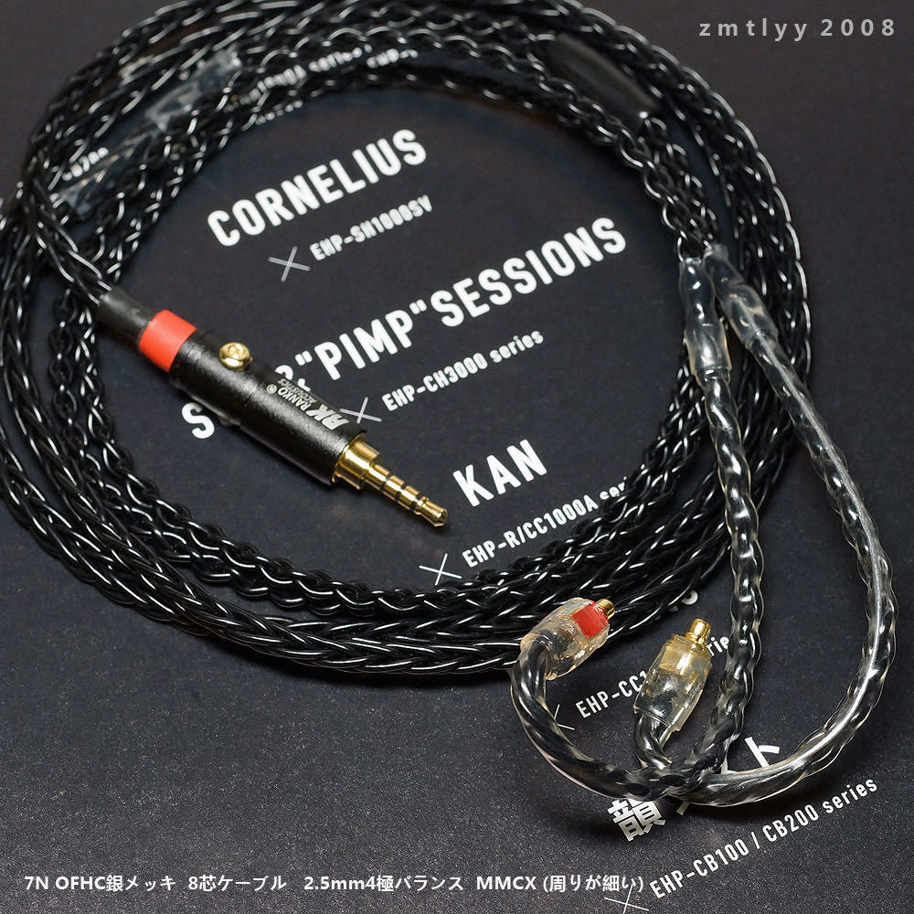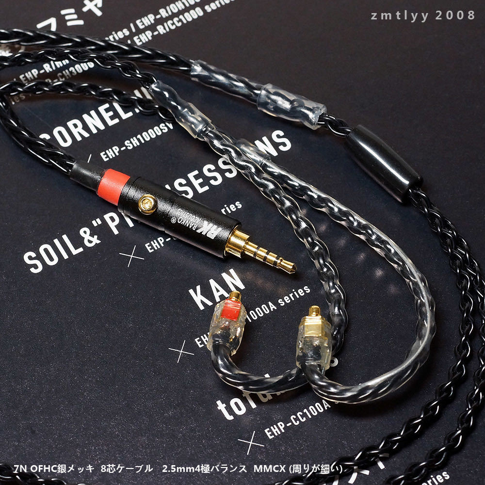 銀メッキOFC ( 0.08mm x 19本 )線材を八本使用して編み込み仕様で作製したMMCXコネクタ 2.5mm4極アルミボディプラグケーブルです。