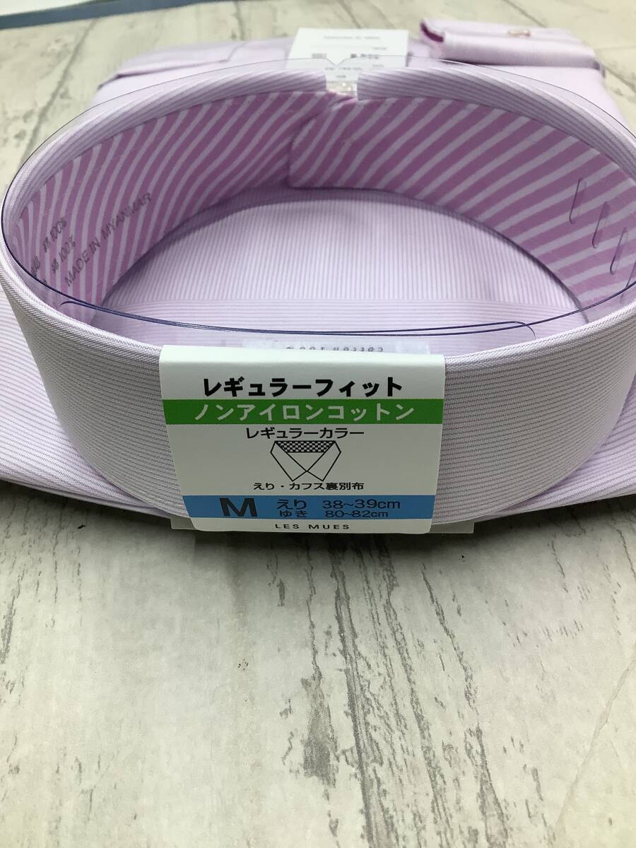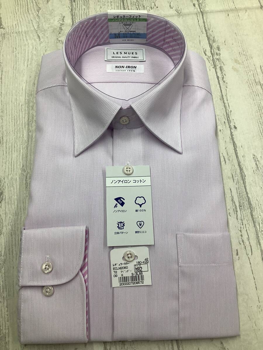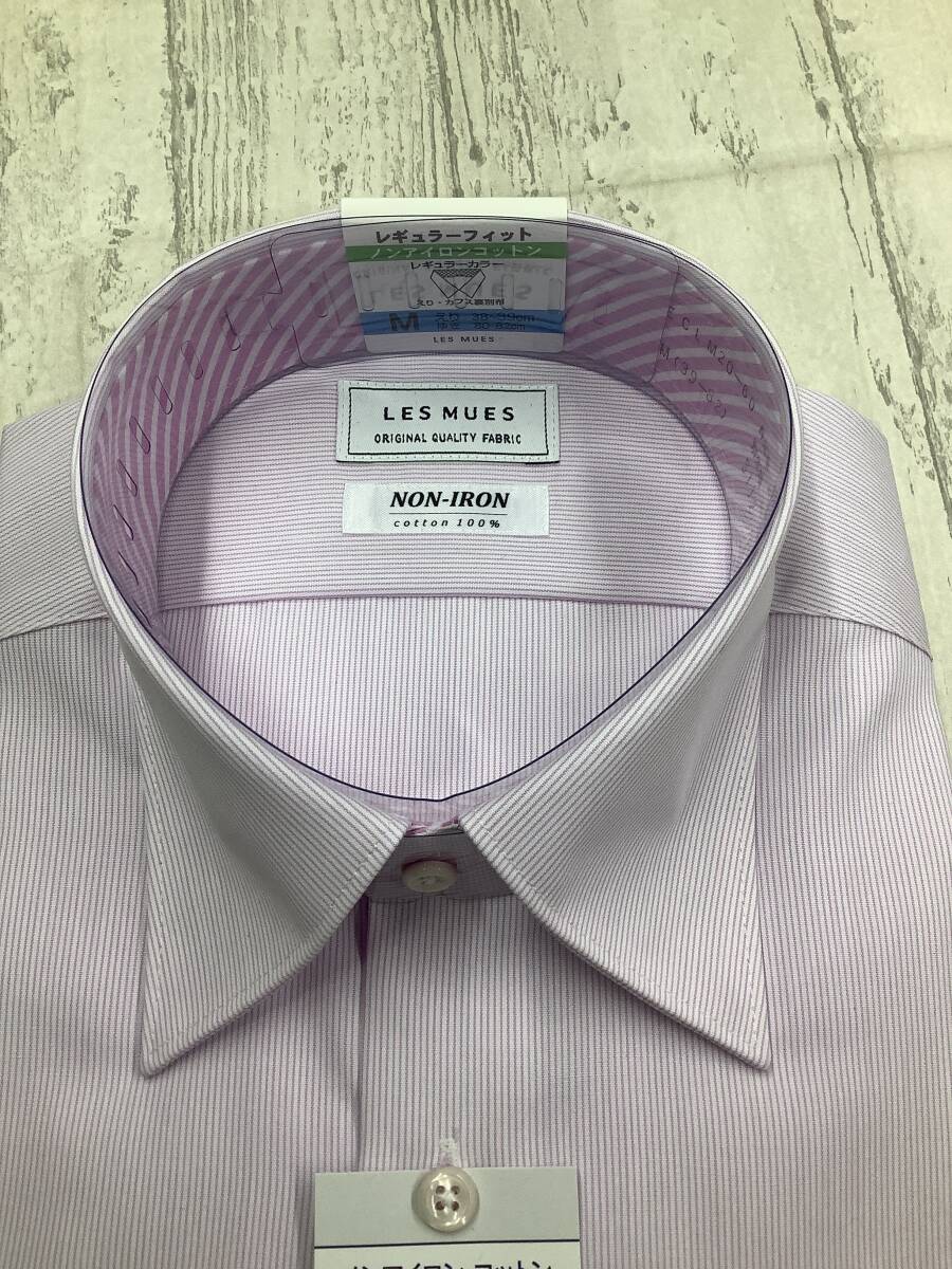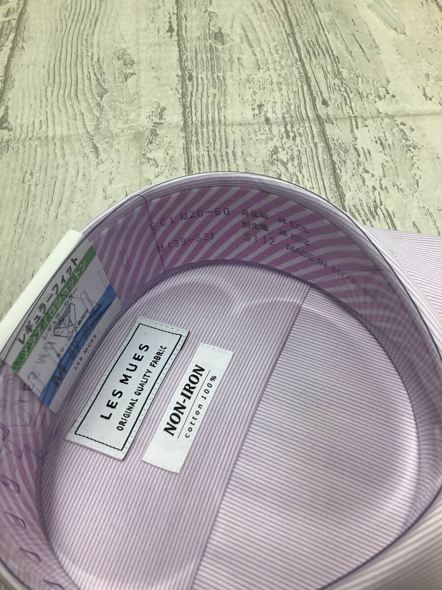 ★39-82 長袖Mサイズ レギュラーカラー★ドレスシャツ ノンアイロンコットン  淡いピンク色細かいストライプ柄