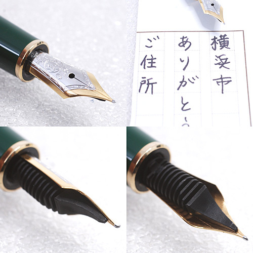 こちら、スターリングシルバーに、ゴールドプレートを施したバーメイル仕様。144サイズ。 カートリッジ、コンバーターの両用式ですが、コンバーターは付属しておりません。 キャップには、ニコライ1世の妻アレクサンドルがエルミタージュ宮殿内に作らせた、「孔雀石の間」にちなんで、マラカイト(孔雀石)を採用。 美しく鮮やかなグリーンのグラデ―ションの異国情緒漂う風合いが、卓上を魅惑的に彩ります。 クリップリングには、シリアル、GERMANY METAL2の刻印あり。 クリップ裏には、何も刻印はございません。 ペン先字幅は不明ですが、見た目のニブサイズは、EF字の様に見えますが、実際、試し書きした所、F字の様に感じます。 明確な字幅は分かりませんので、あくまで参考までにお願い致します。 試し書きは原稿用紙で行っておりますので、合わせてご参考ください。 |