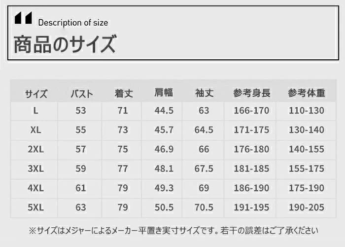 サイズ:L、XL、2XL、3XL、4XL、5XL