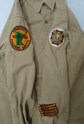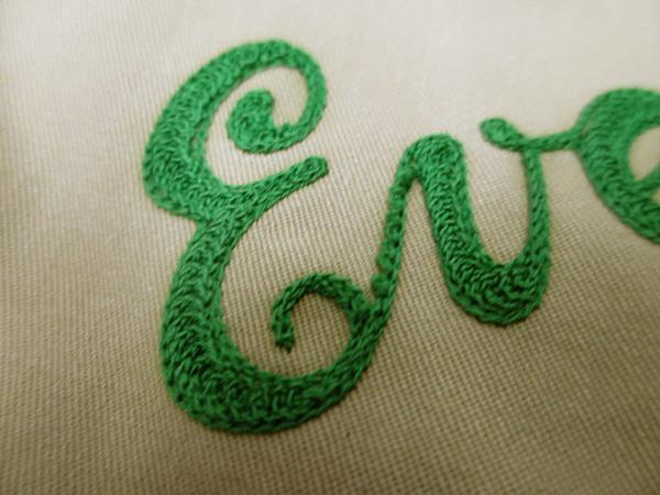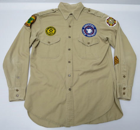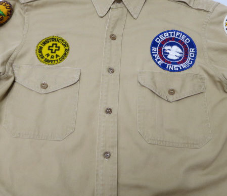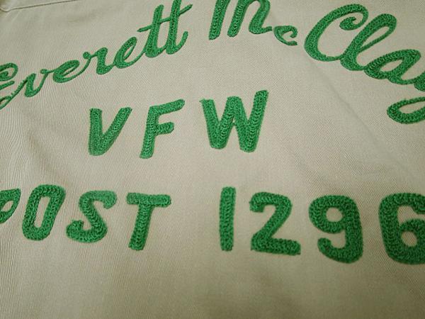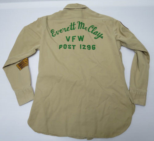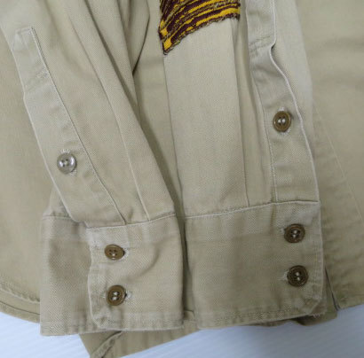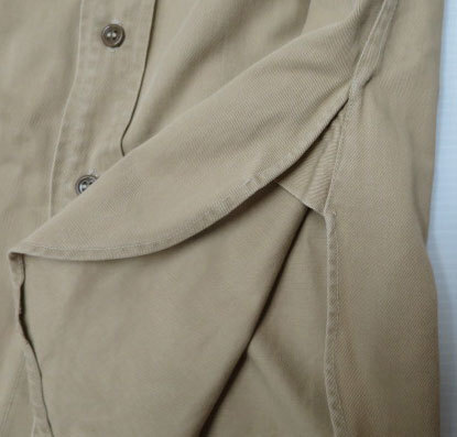 アメリカで買い付けてきましたタグなしで詳細は不明ですが恐らく50年頃のミリタリーシャツベースで素材は綿で裾まち付きの後文字チェーンステッチの両胸&両袖はパッチ貼り付けのカーキ(ベージュ)です。
