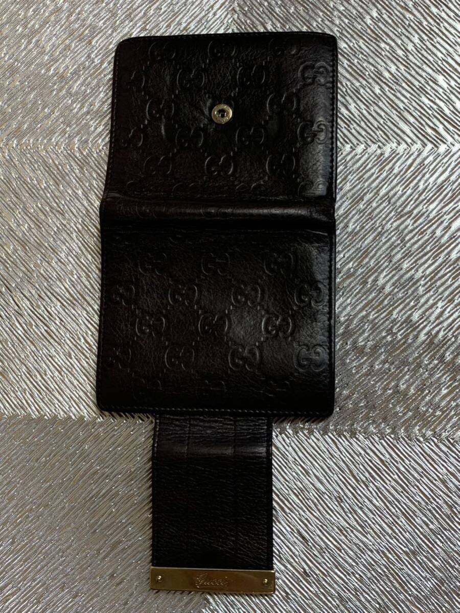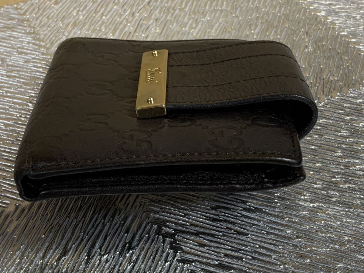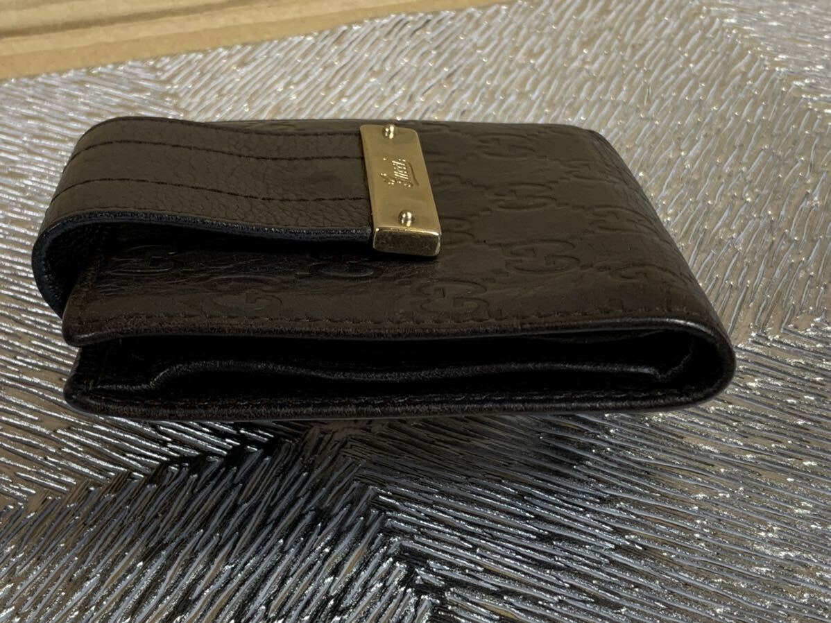 中古GUCCI財布の出品です。GG柄シマレザーの濃い茶色財布です。シリアルナンバーは写真でご確認下さい。シンプルなデザインで男女兼用です。使用感はあります。金具の変色、スレ、傷、汚れ等はあるかと思いますので必ず商品の状態をご確認下さい。Made in Italyイタリア製です。