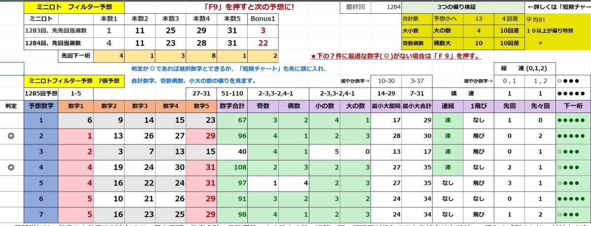 フィルター予想とは、フィルターを掛けると、当たる数字を自動判定し◎が表れますので、合計数字の予想から最適な数字の並びを選びます。