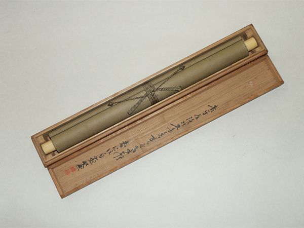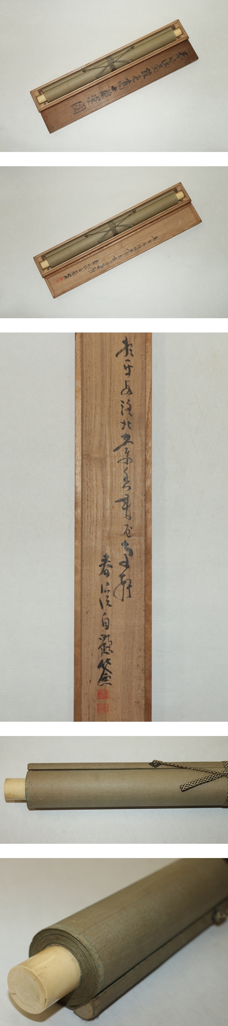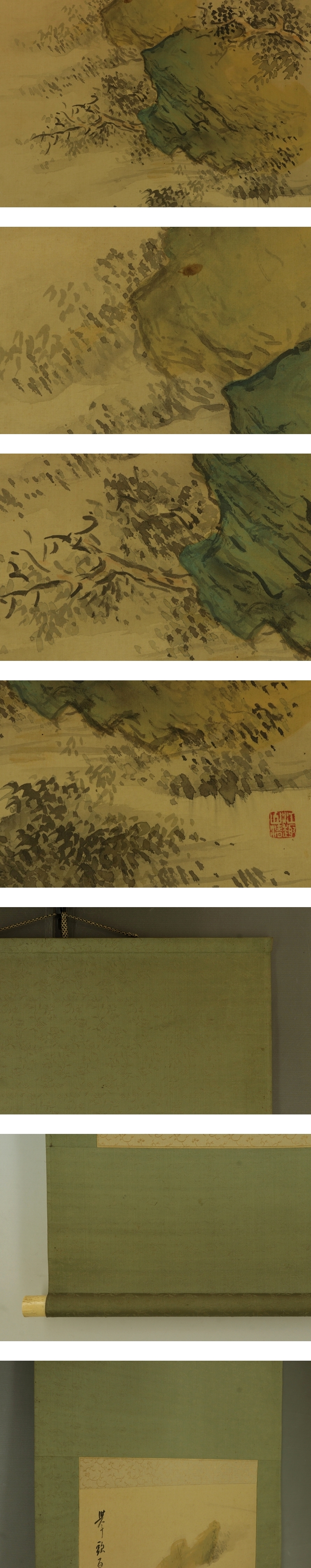 横山春渓 よこやま-しゅんけい 日本画家。岐阜県生。本名力丸。号に蒼翠園・石蘭書屋。田近竹邨に南画を学び、 橋本関雪・堂本印象に師事した。京都絵専卒。帝展・日展・新日展で入選を重ねた。 昭和54年(1979)歿、79才。 本紙は、染み、汚れ、ヤケがあります。 表装は、染み、汚れ、皺、くすみ、虫食い、ほつれ、破れ、軸先にヒビがあります。 【サイズ】 作品 横約36.5cm×縦約129cm 表装 横約49cm×縦約194cm |
