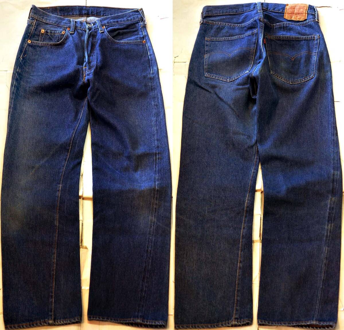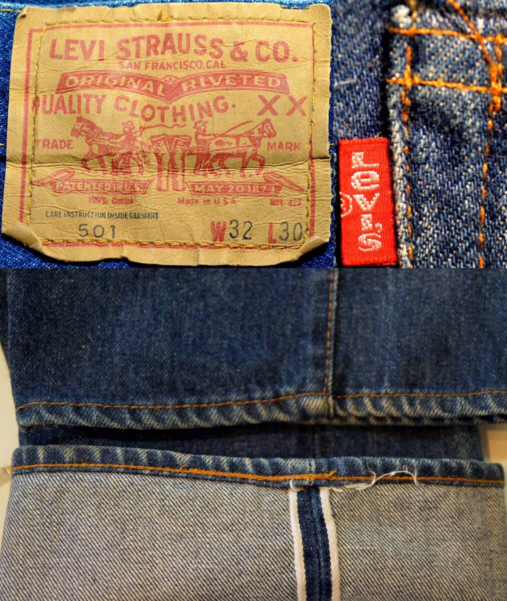 501の66後期です。復刻、レプリカではありません。『ディテール紹介』 バックポケット裏チェーンステッチ、フロントトップボタン裏の刻印6、裾オリジナルチェーンステッチ。初期のモデルです。『状態』多少のUSED感はありますが、ノーダメージ、ノーリペアの極上品です。生地もしっかりしています。『色落ち、特徴など』極上物の501 66後期です。まだ全体的に色も残っており、特筆するダメージも一切ない極上物です。裾は理想的なヨジレ・アタリが出ており、良い雰囲気です。サイド赤耳も綺麗に開き、一直線のアタリが出始めております。ガンガン穿きたい方にも自信を持ってお勧めします。ボタンホールもあまり開け閉めされていないようで、まだ固い状態です。
