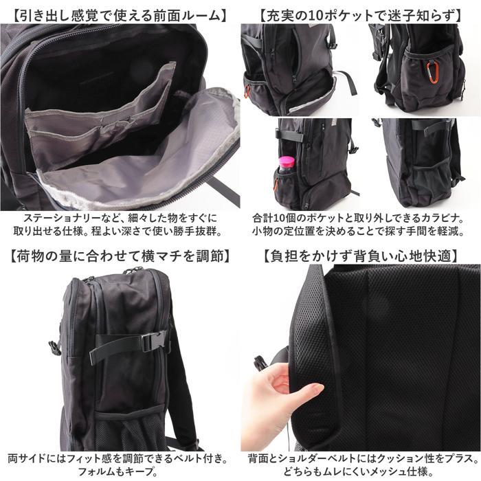 | 注意点 | ※※【ポケット仕様】 ※背面ルーム:オープンポケット×1 ※前面ルーム:面ファスナーポケット×1、オープンポケット×2、ペンポケット×2 ※前面:縦ファスナーポケット×1、ファスナーポケット×1 ※サイド:ゴム入りオープンポケット×1、ゴム入りメッシュポケット×1 ※ ※年月の経過や空気中の湿度や紫外線、熱や汚れ等により、劣化などが生じる場合があります。 ※長時間日光にあたったり、摩擦、水漏れなどによる色落ちや色移りすることがあります。 ※お取り扱いの際は、商品やパッケージなどに記載されている品質表示、アテンションタグ、ご使用上の注意事項などを必ずご確認下さい。 ※本来の目的以外にはご使用にならないで下さい。 ※カメラやモニターの性質により、画像と実物の色の違いがある場合がございますのでご理解願います。 |