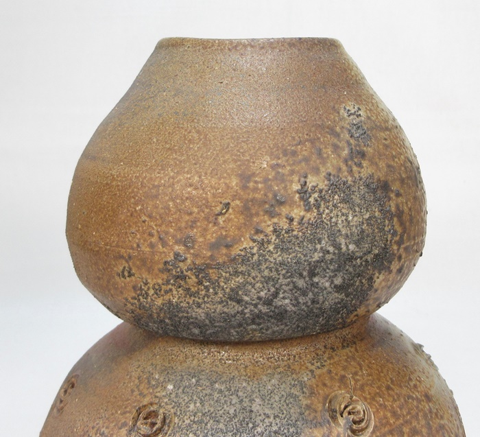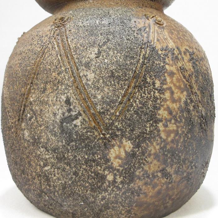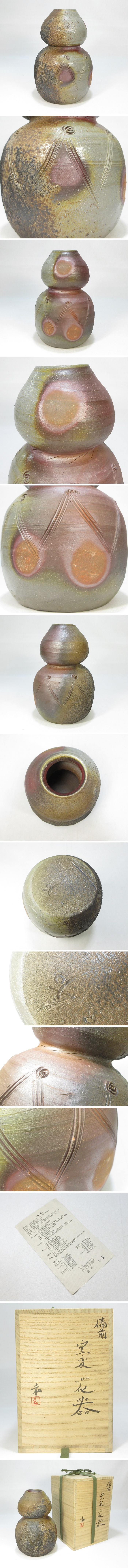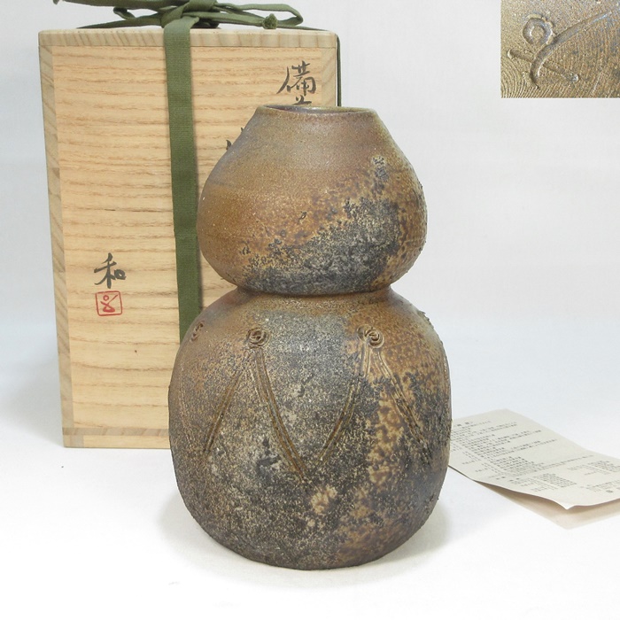 【A0125】備前焼 藤原和 窯変 瓢形彫文 花器 花入 花瓶 共箱 栞付