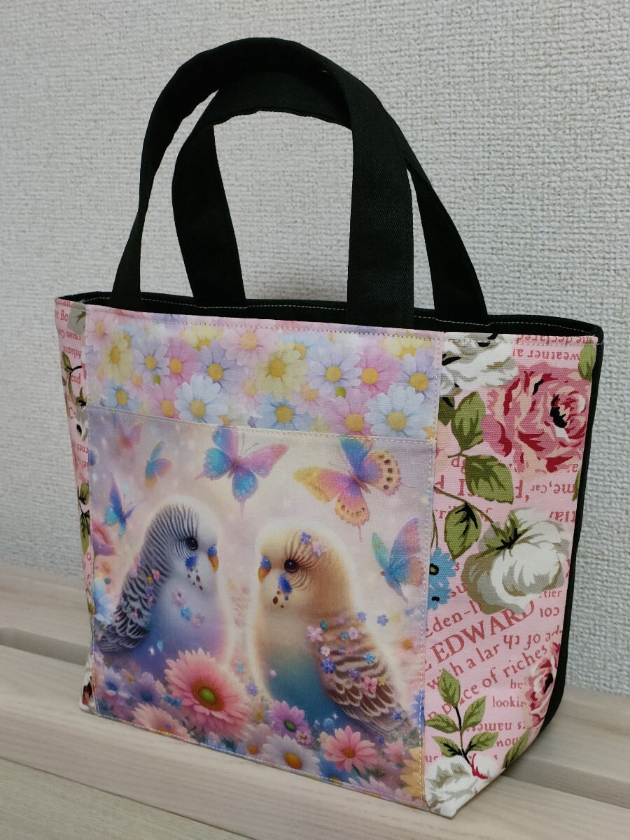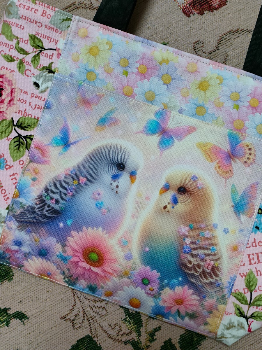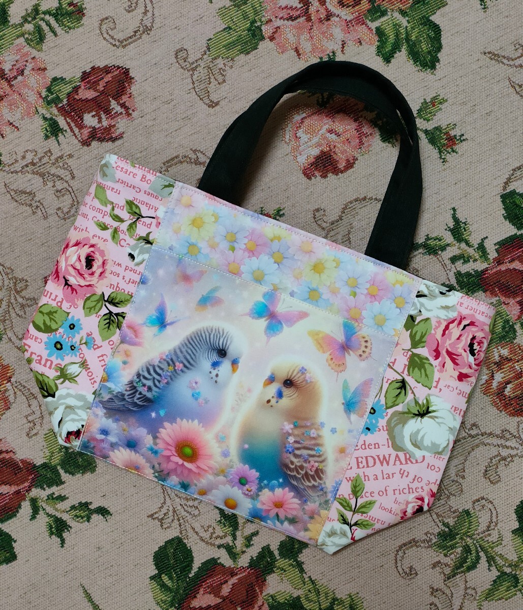 色鮮やかなインコと花柄におしゃれな英字プリントのミニトートバッグはいかがでしょうか(^-^)