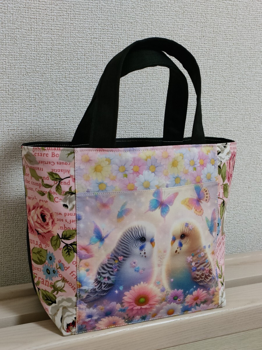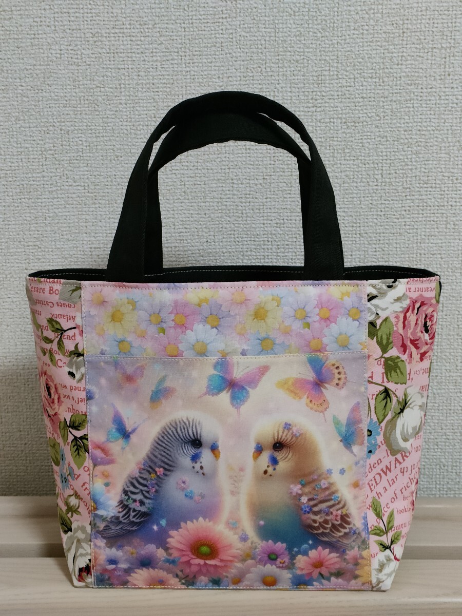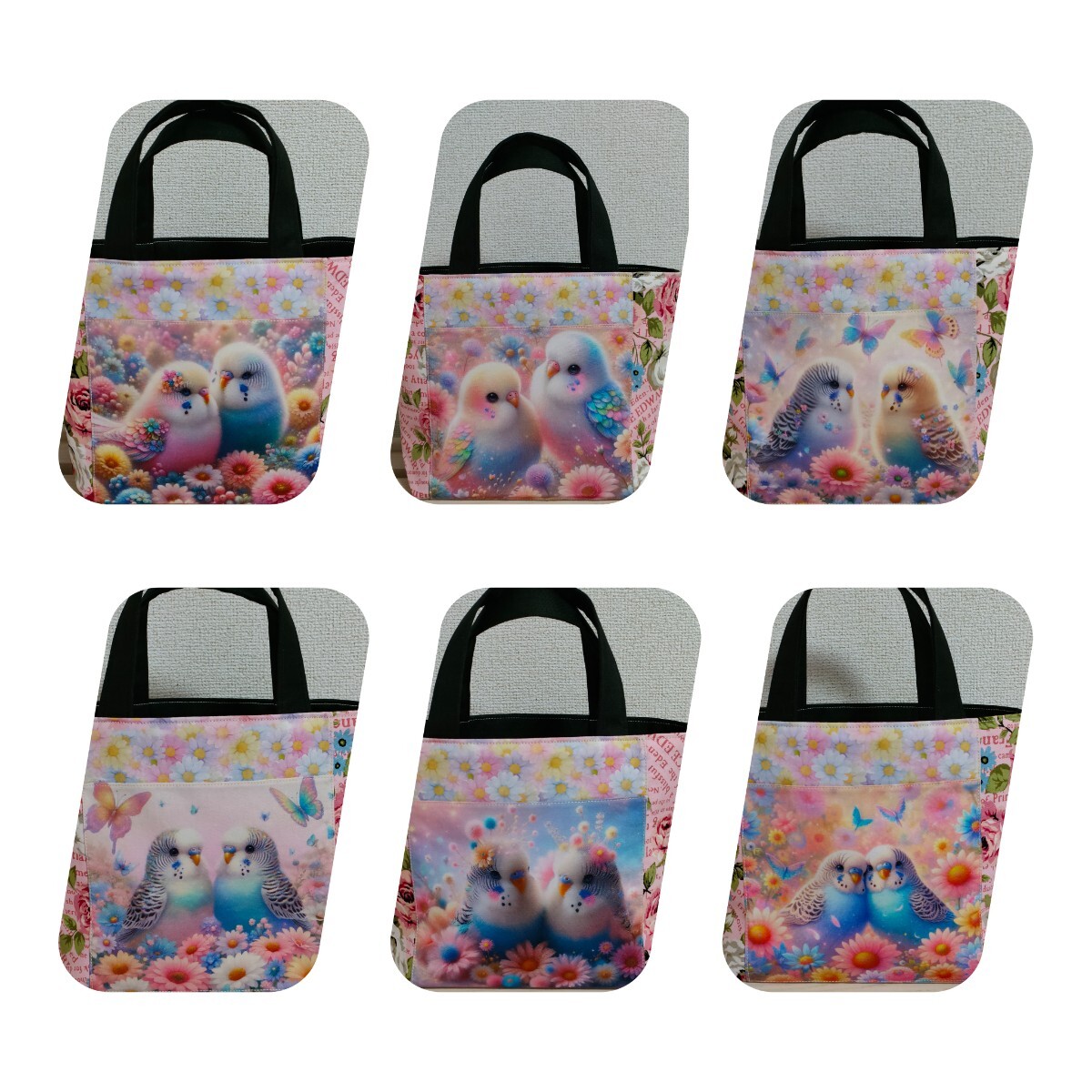 色鮮やかなインコと花柄におしゃれな英字プリントのミニトートバッグはいかがでしょうか(^-^)