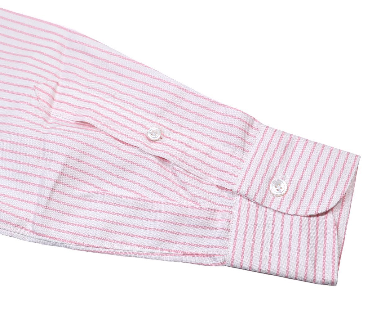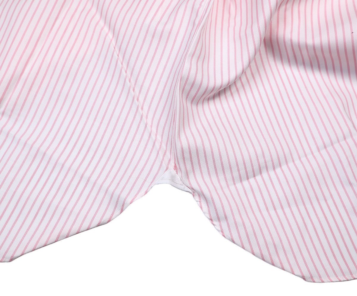 上質なコットン素材を使用した、きれいな色合いのピンクとホワイトのストライプ柄。リッチな輝きを放つ、肉厚な白蝶貝ボタンからも見るからに高級シャツだとわかります。