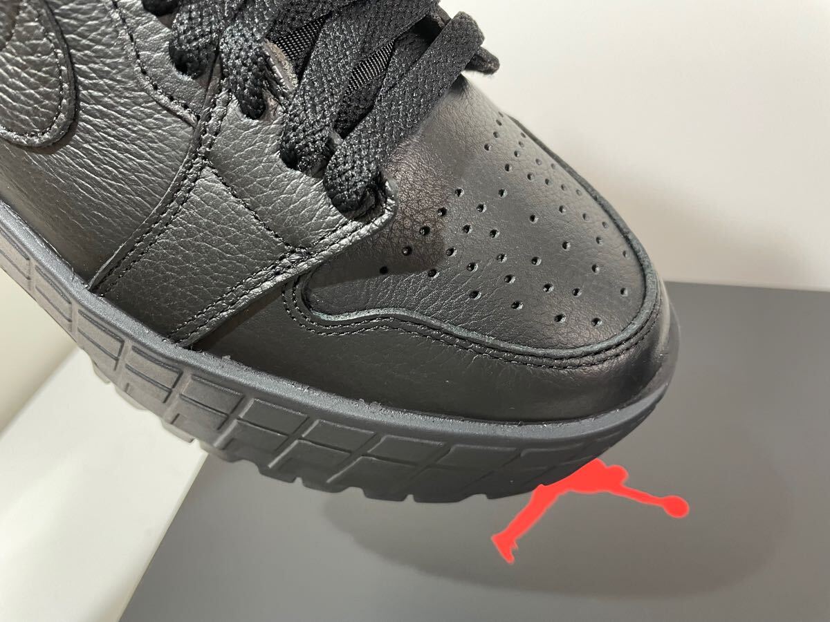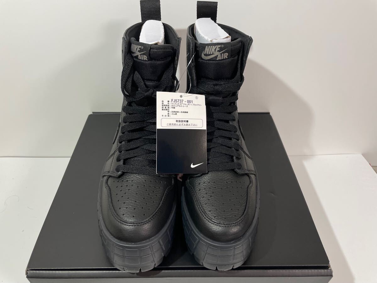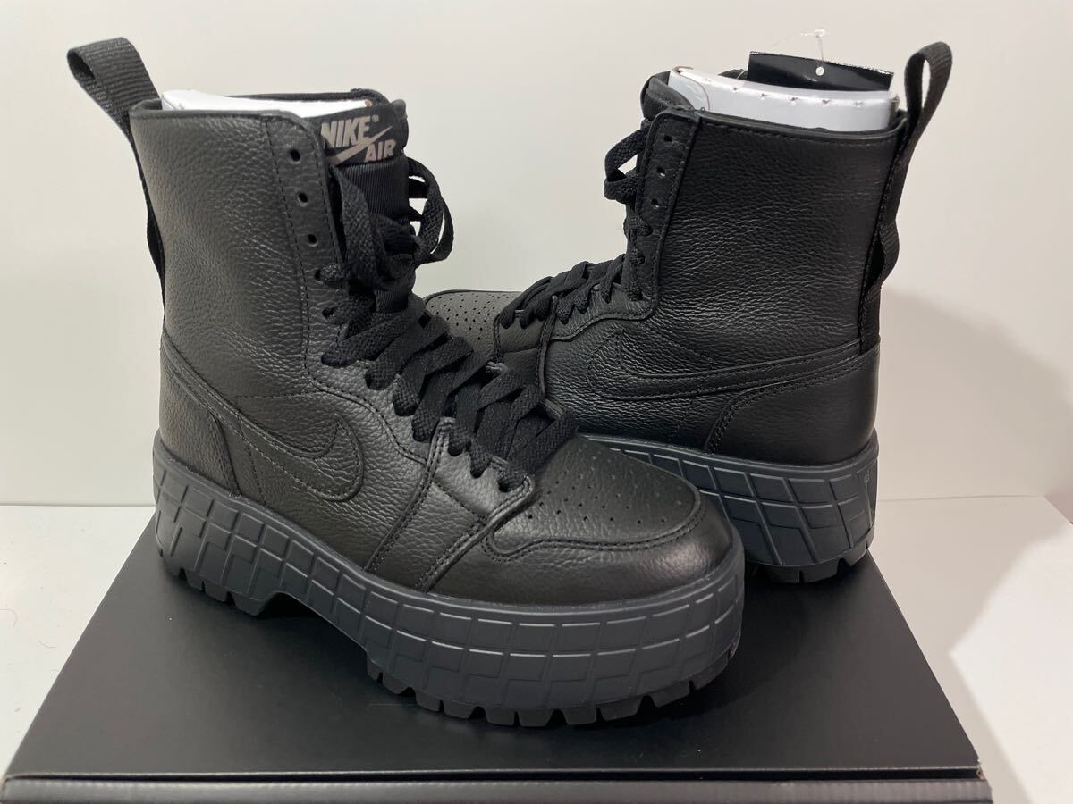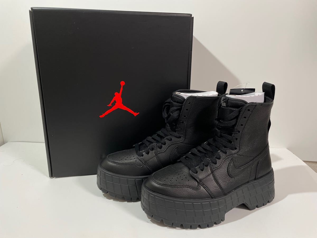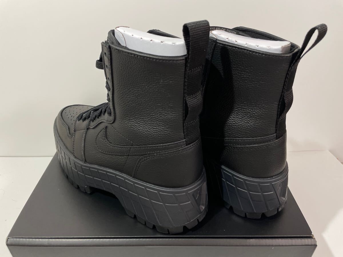 "AJ1"のパーツ構成を組み合わせながら、ブーツスタイルへ仕上げ、さらには頑丈なプラットフォームソールを装着。またオールブラックで仕上げることで、タフさを強調することに成功している。シューズボックスも特別仕様になるなど、"AJ1"の新たな価値を探求するアグレッシブな逸足となっている。