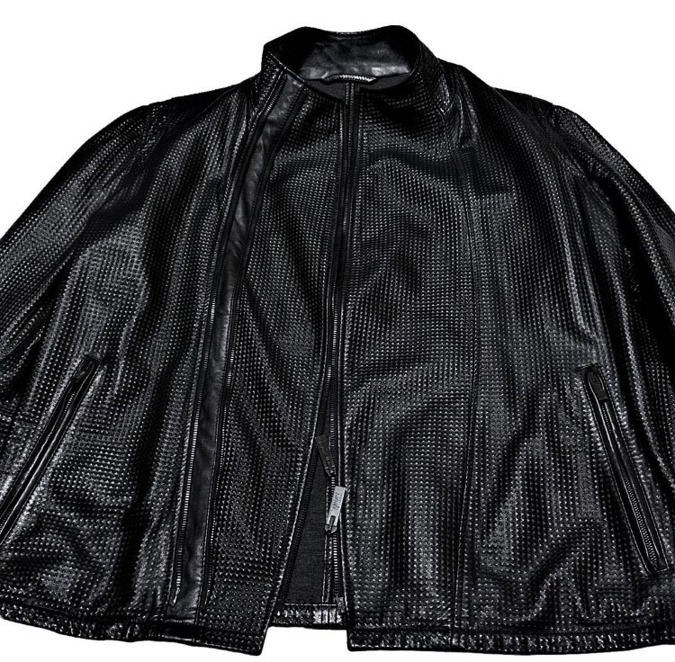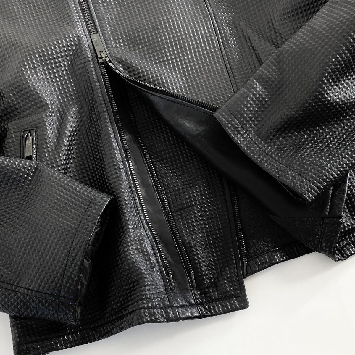レザージャケットには珍しい表面にピラミッド状の立体的なクロコ型押し加工 -リザード型押し- が施されており、傷や汚れにはあまり強くないラムナッパを強化・補強しています。